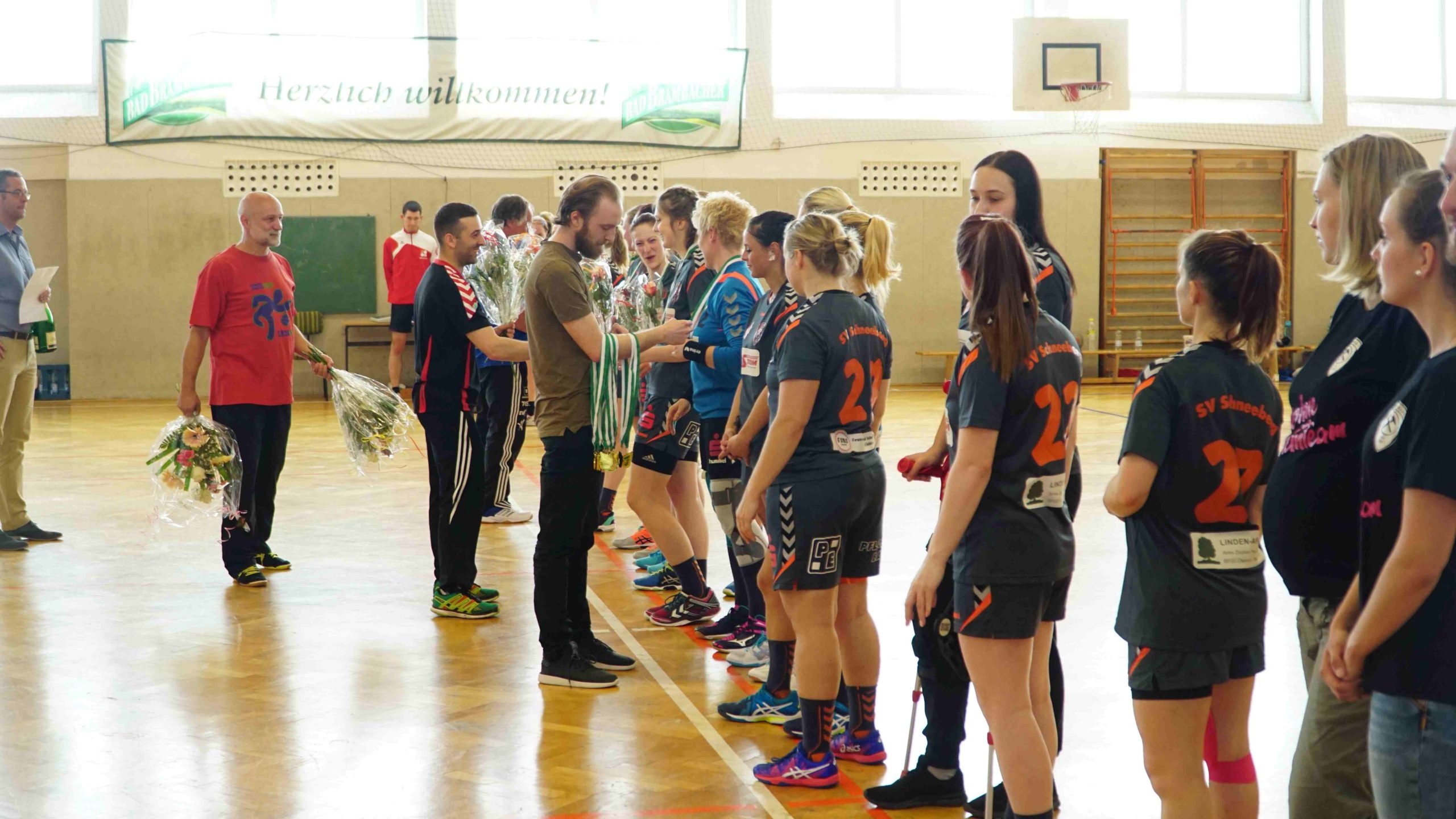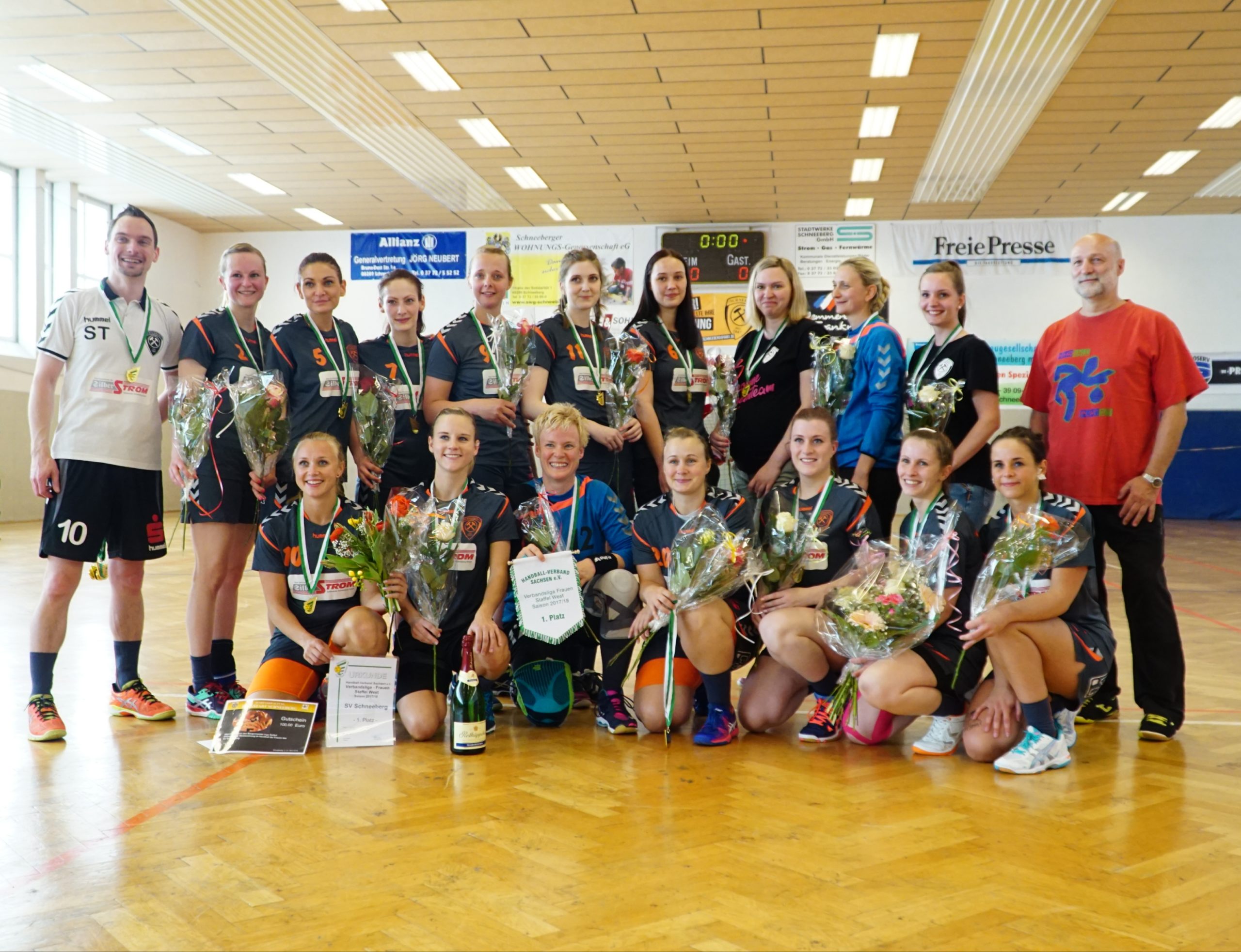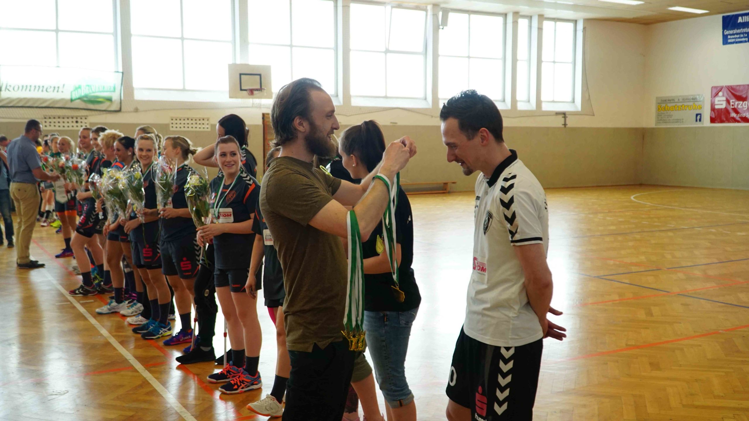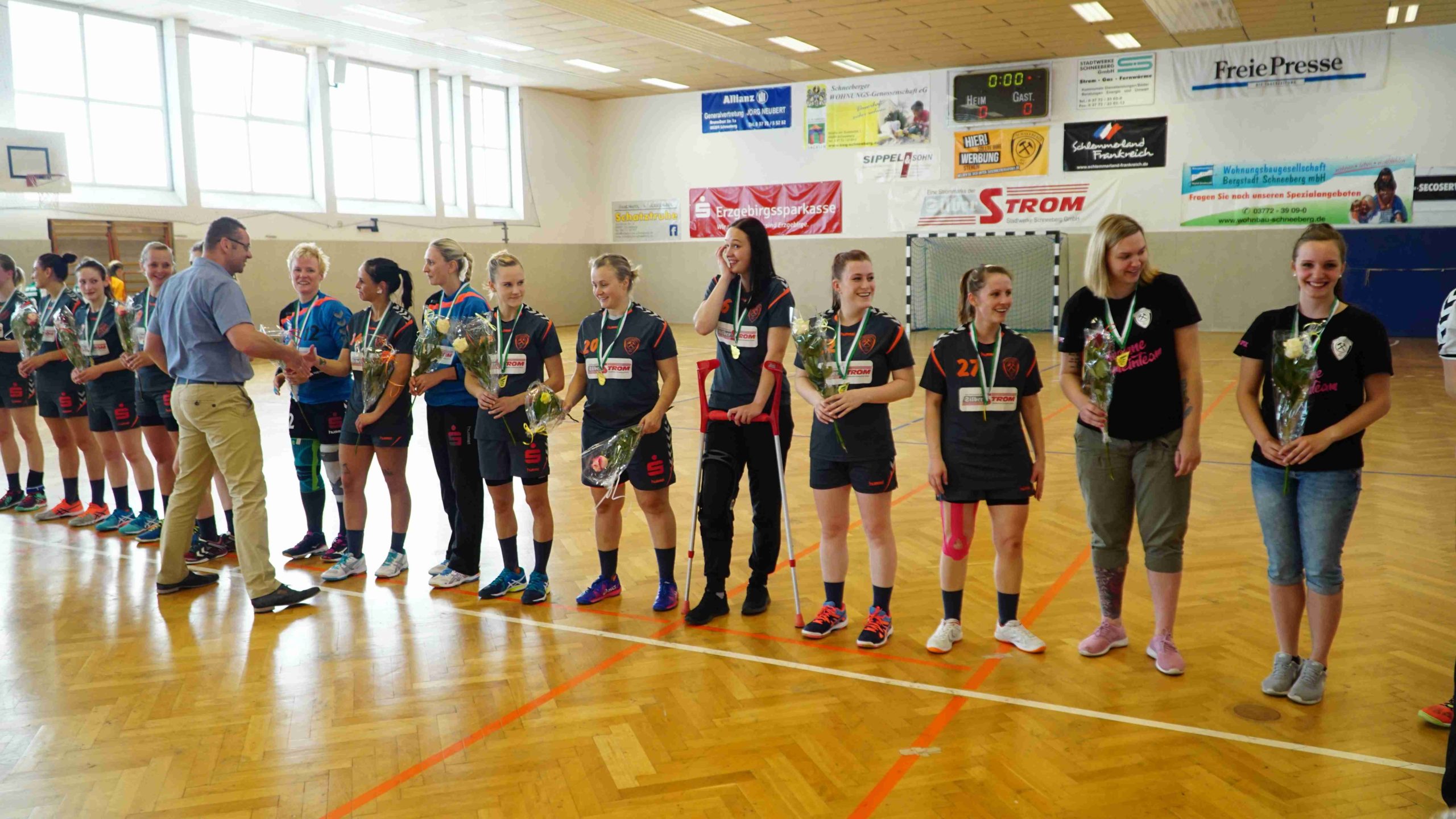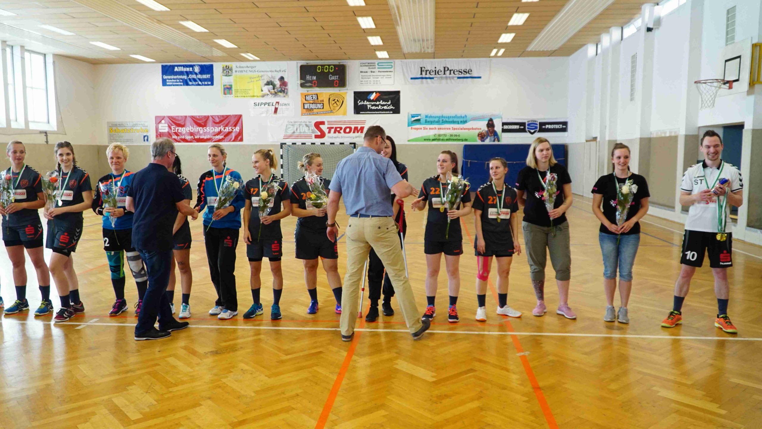 Zum letzten Spiel der aktuellen Saison stand die Heimpartie gegen die zweite Vertretung des HSV Marienberg an. Und wir möchten uns zunächst noch einmal recht herzlich bei der Marienberger Mannschaft und dem Trainerteam bedanken. Denn sie reisten durch Verletzungen gebeutelt mit gerade einmal 8 Spielerinnen an und bewiesen somit wahren Sportgeist! Großen Respekt an die Spielerinnen und das Trainerteam dafür. Trainer Stefan Süßmilch brachte zusätzlich einen Strauß Blumen mit, den er vor Spielbeginn unserer Kapitänin Linda Leonhardt überreichte und zur Meisterschaft gratulierte. Und er sollte nicht der letzte Gratulant an diesem Abend werden. Denn vor Anpfiff gab es noch die offizielle Ehrung durch Jan Schreiter (Handballverband Sachsen). Und auch unser Bürgermeister Ingo Seifert und Vorstands-Vizepräsident Klaus-Dieter Voigt (SV Schneeberg) ließen es sich natürlich nicht nehmen uns auch persönlich vor Ort für die Leistung zu gratulieren. An alle noch einmal ein herzliches Dankeschön dafür!