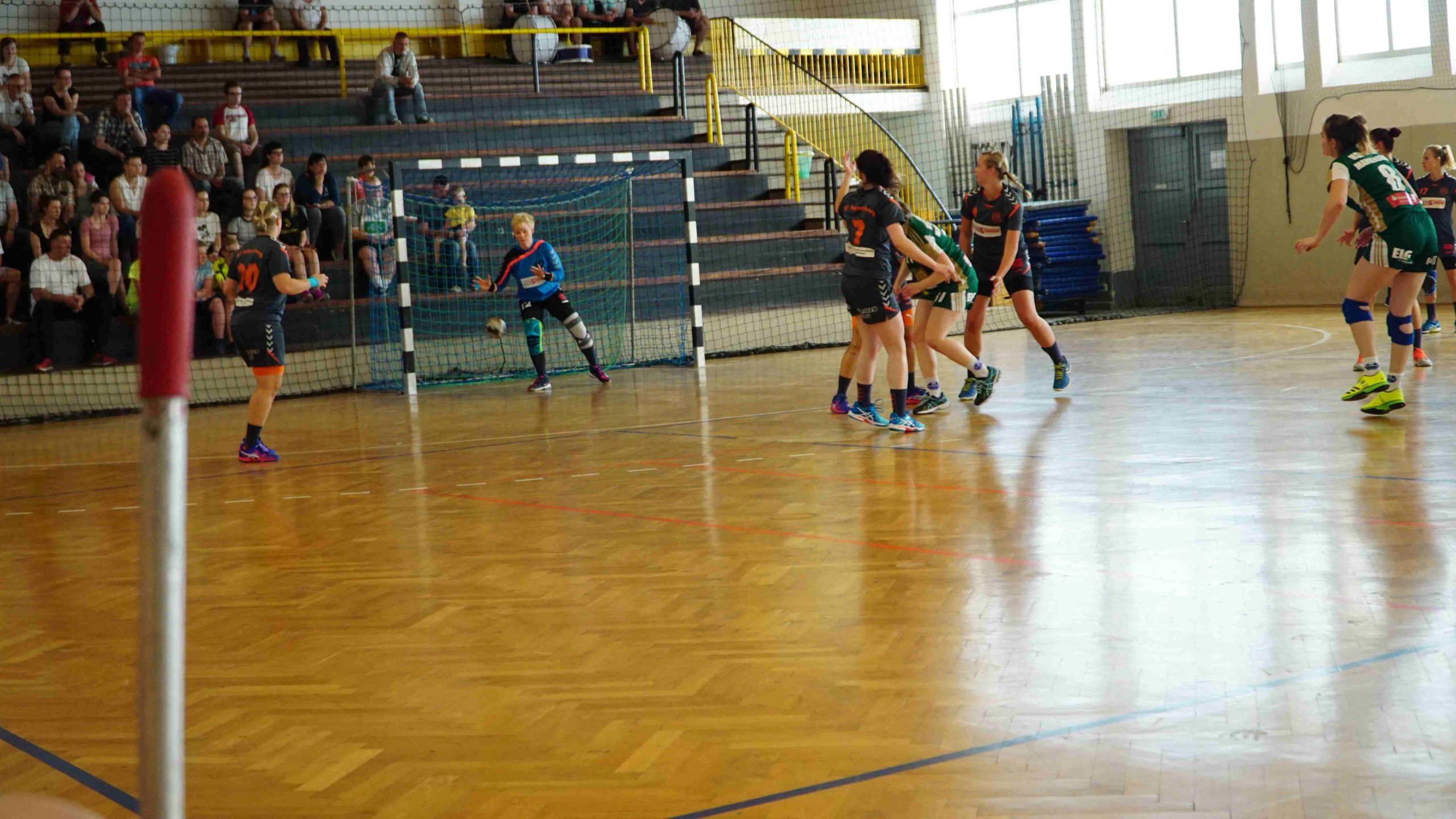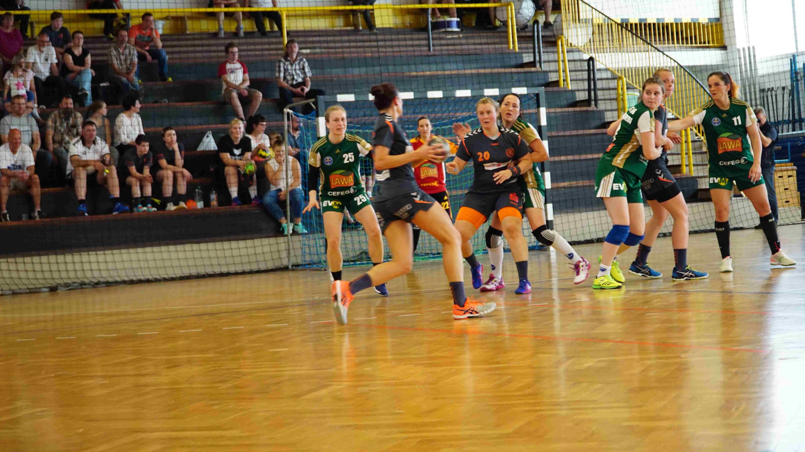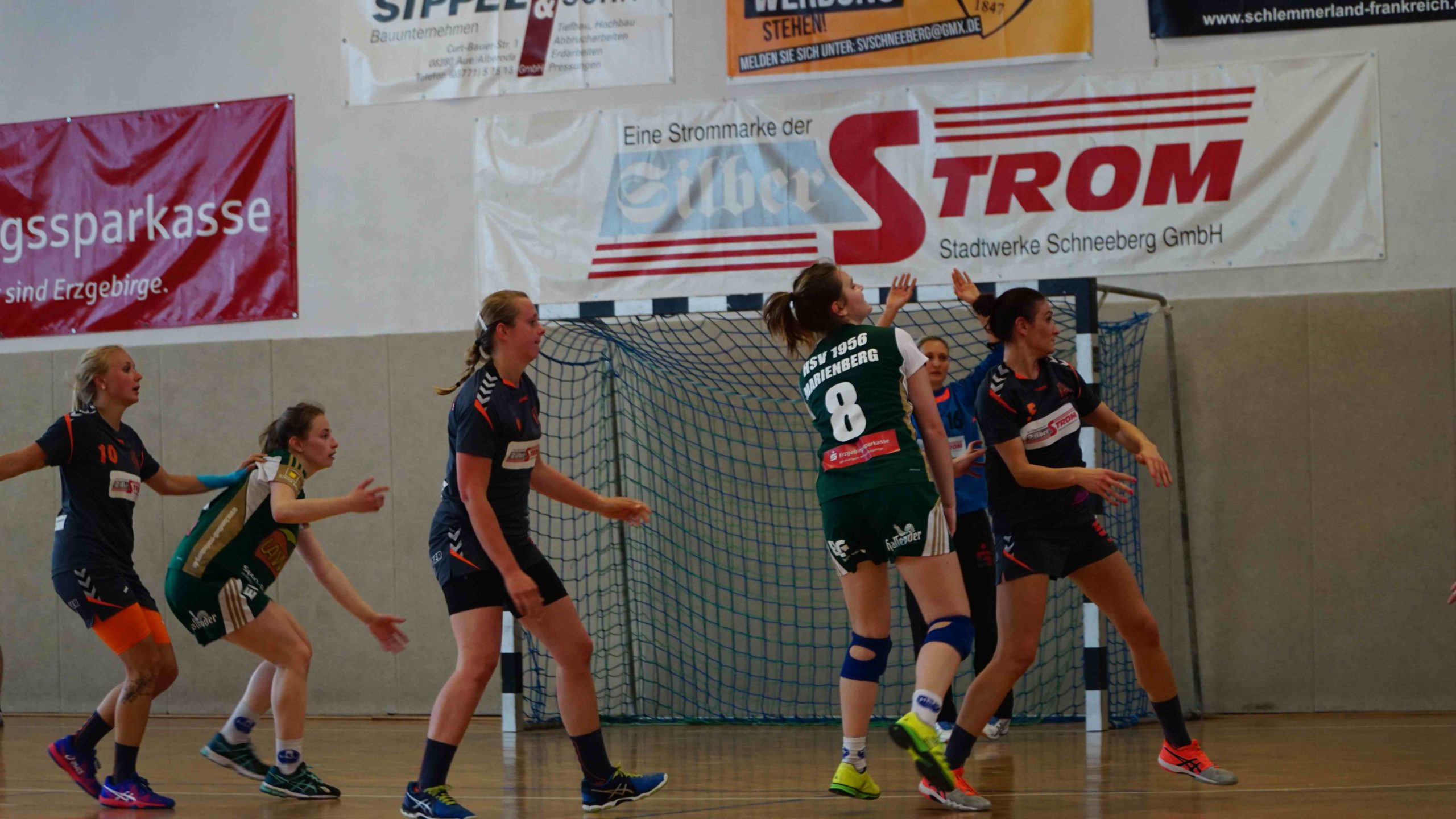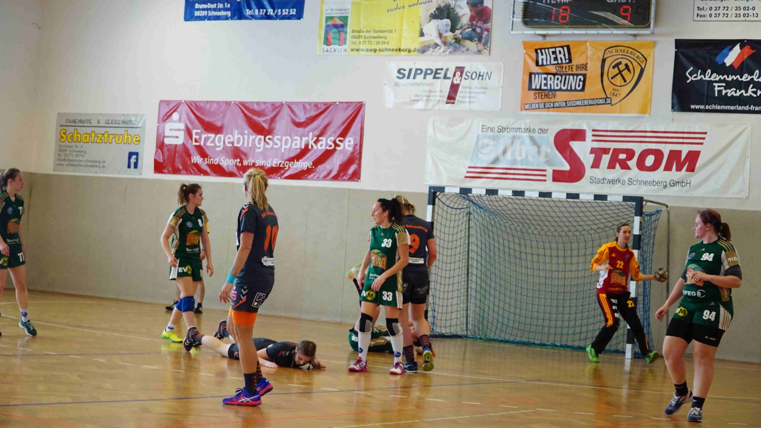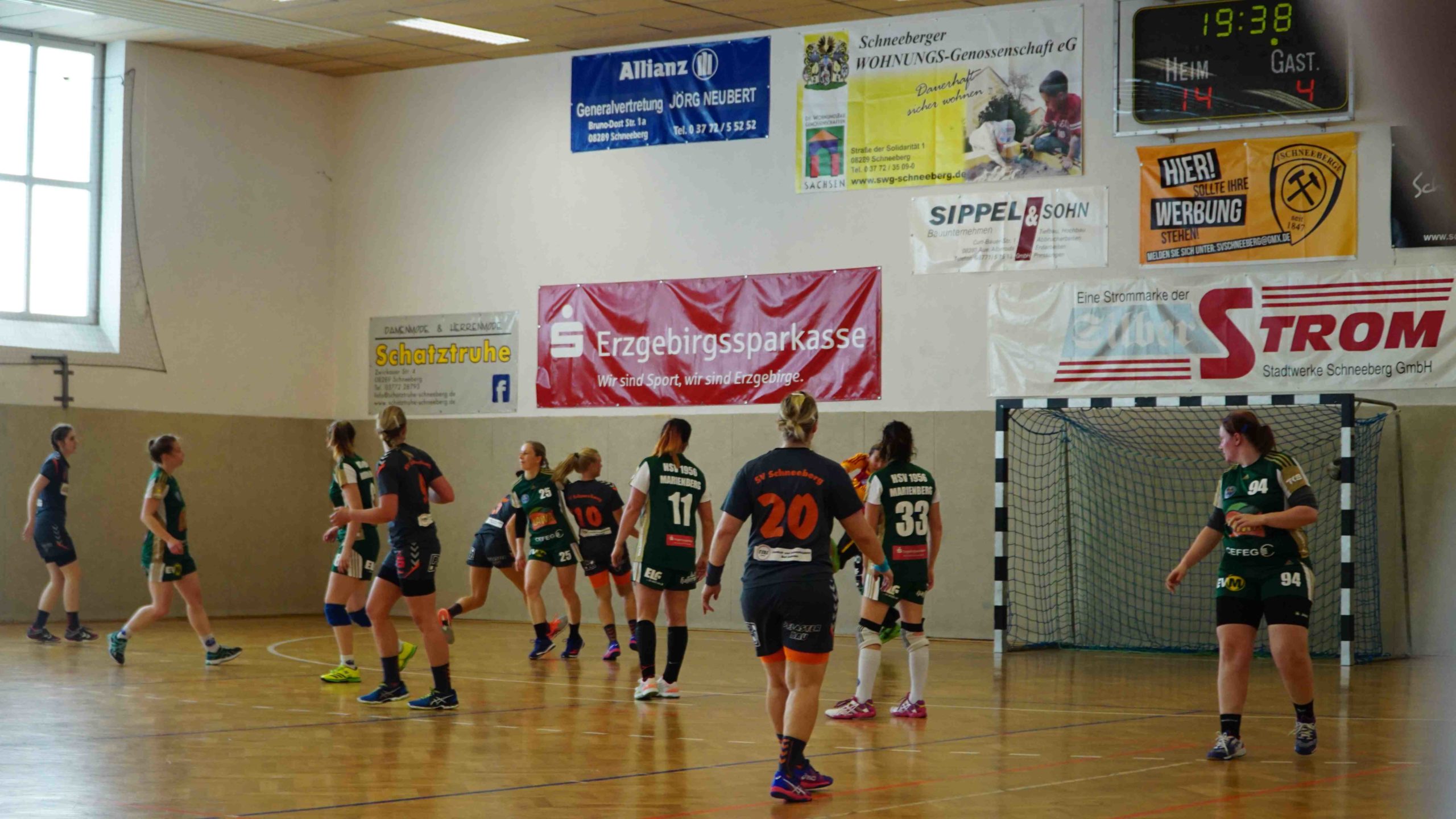 Und jetzt zum Spiel an sich… 🙂 Mit Anpfiff der Partie waren wir hellwach und wollten sofort die Weichen für einen sicheren Sieg stellen. Und das gelang uns auch direkt. In der Abwehr ließen wir dem Marienberger Angriff nur sehr wenig Raum sich zu entfalten und standen sehr kompakt und sicher. Somit konnten wir viele Bälle erkämpfen und schalteten sofort über die 1. und 2. Welle in den Angriffsmodus um. Schnell war über mehrere Konter nach 6 Min. ein 5:1 Vorsprung herausgespielt. Und auch in den folgenden Minuten lief für uns alles rund. In der Offensive überzeugten wir weiterhin mit hohem Tempo und arbeiteten mit viel Druck in die Nahtstellen der Marienberger Abwehr. Durch sehenswert herausgespielte Angriffe waren wir über alle Positionen erfolgreich und da unsere Abwehr inkl. Annett Keßler im Tor sich wieder einmal zum unüberwindbaren Bollwerk entwickelte, bauten wir die Führung jetzt stetig aus. Bis zur 16. Min. erzielten wir so, über die Stationen 7:1 (10.Min.) und 10:1 (12. Min.), eine beruhigende 13:1 Führung. Bis zur Halbzeit gingen wir etwas fahrlässig mit unseren Tormöglichkeiten um und da auch die Marienbergerinnen einen aufopferungsvollen Kampf boten, ging es mit einem 18:9 in die Pause.