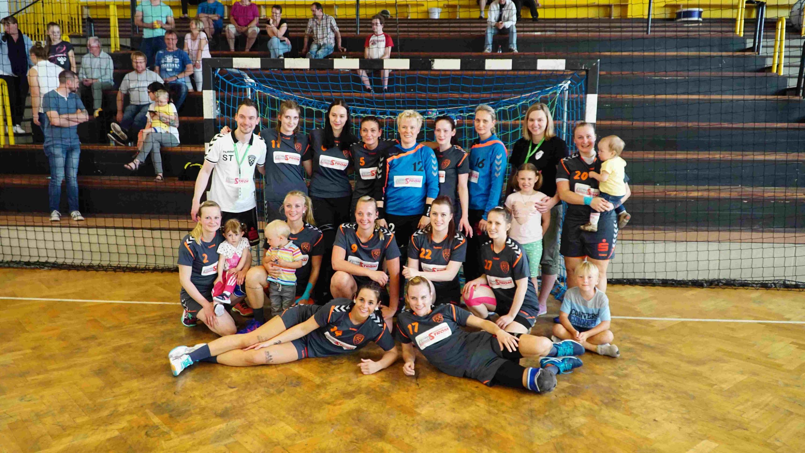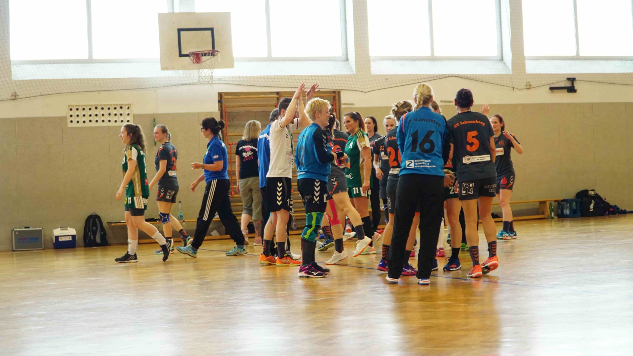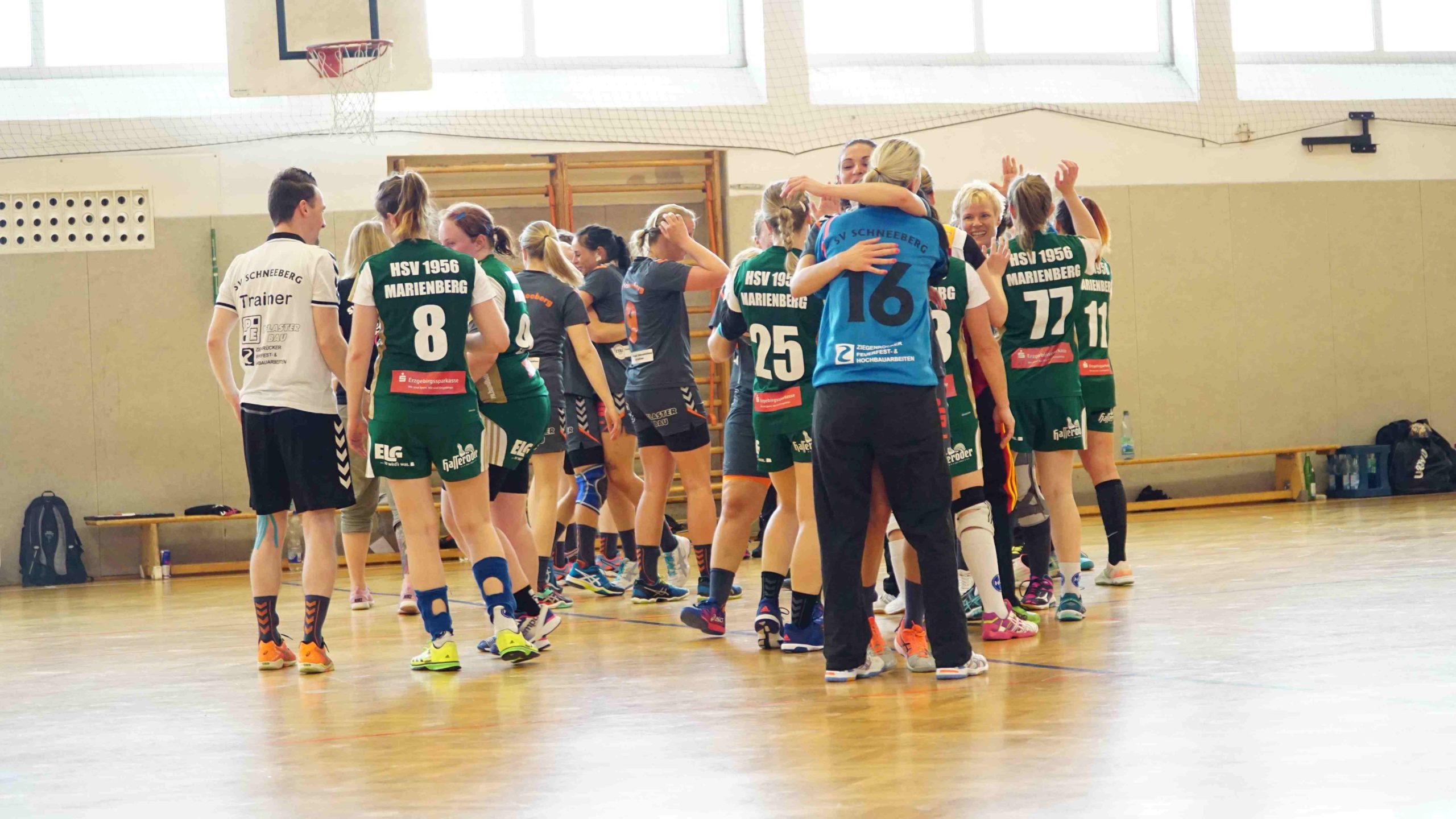 Und dies setzten wir auch sehr gut um. Der Verlauf der zweiten Hälfte ist schnell erzählt. Wir konnten auf fast allen Positionen auf Wechselmöglichkeiten zurückgreifen und egal wer gerade auf der Platte stand, jede Spielerin brachte sich schnell erfolgreich ins Spiel ein. Hinzu kamen natürlich auch die jetzt nachlassenden Kräfte auf Marienberger Seite. Wobei man ihnen und dem Trainerteam auch hier wieder ein Kompliment machen muss, denn sie gaben niemals auf und kämpften bis zur letzten Spielminute sehr aufopferungsvoll. Respekt dafür!! Wir spielten diese 30 Minuten also recht souverän herunter, auch wenn natürlich der ein oder andere Ball mehr hätte im Tor untergebracht werden müssen. Aber egal, wir gingen auch so langsam in den Feiermodus über. Am Ende ein sehr schöner 37:24 Heimsieg und die weiße Weste 2017/18!! 😀 😀