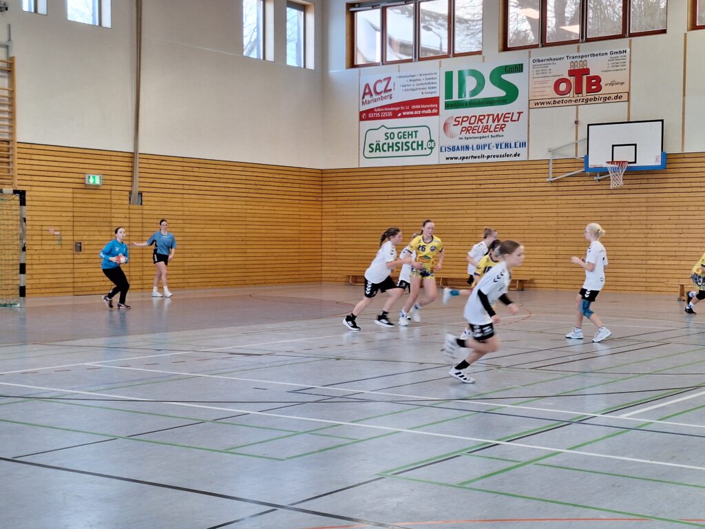 Das Spiel begann überraschend mit einem Blitzstart der Gastgeberinnen. So ging der HSV Marienberg in der 2. Minute mit 1:0 in Führung und sorgte für einen kurzen Moment der Euphorie bei den heimischen Fans. Diese Führung sollte jedoch nur wenige Sekunden Bestand haben. Ab der 5. Minute dominierten die Gäste zunehmend das Spielgeschehen. Sie kombinierten flüssig, nutzten die Lücken in der Defensive des HSV und setzten ihre schnelle Spielweise effektiv um. Bereits in der 10. Minute stand es 2:6, und Marienberg war gezwungen, eine Auszeit zu nehmen, um die Defensive neu zu organisieren. Mit insgesamt fünf Treffern in den letzten fünf Minuten der ersten Halbzeit zog die SG Zschorlau/Schneeberg bis zur Pause auf 2:11 davon.