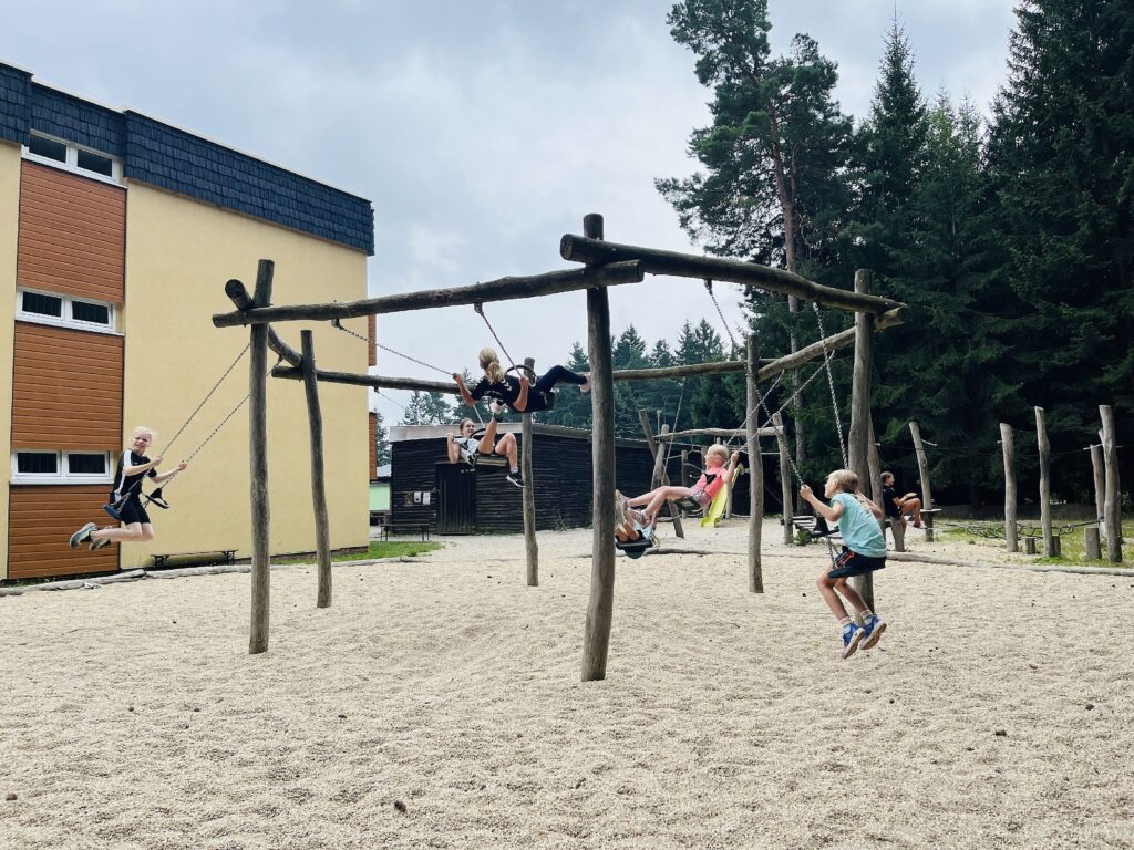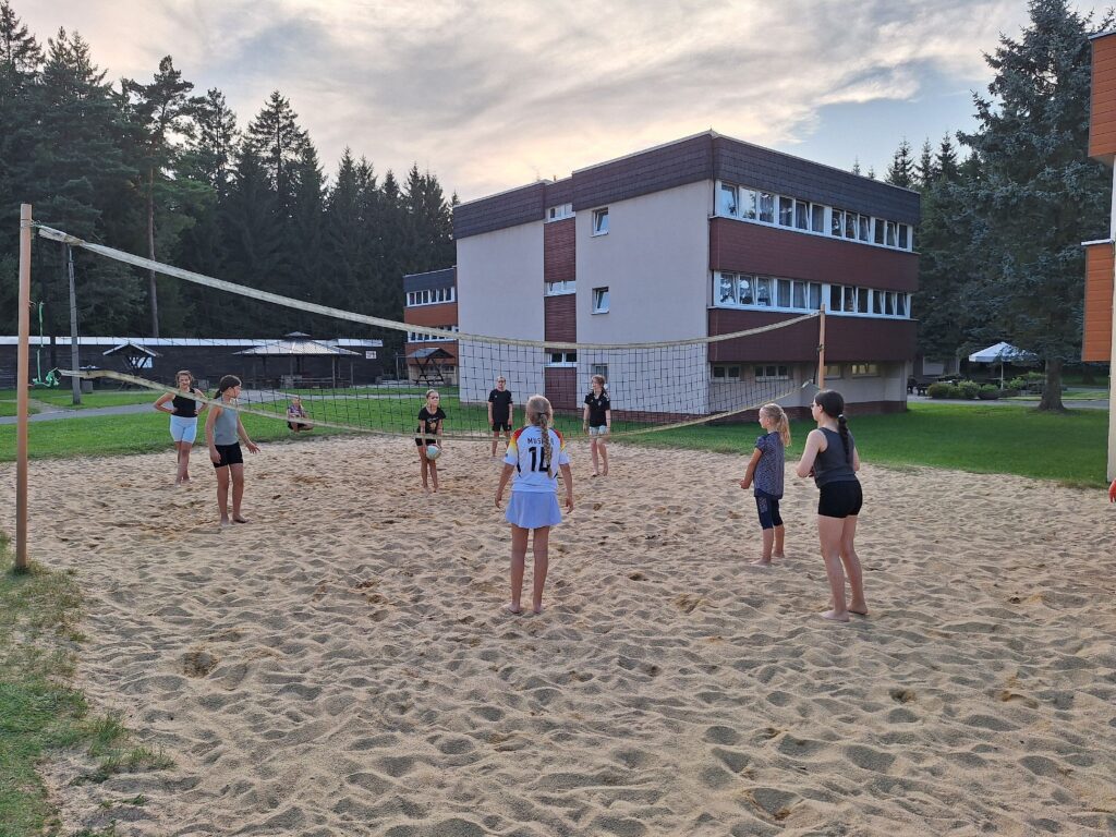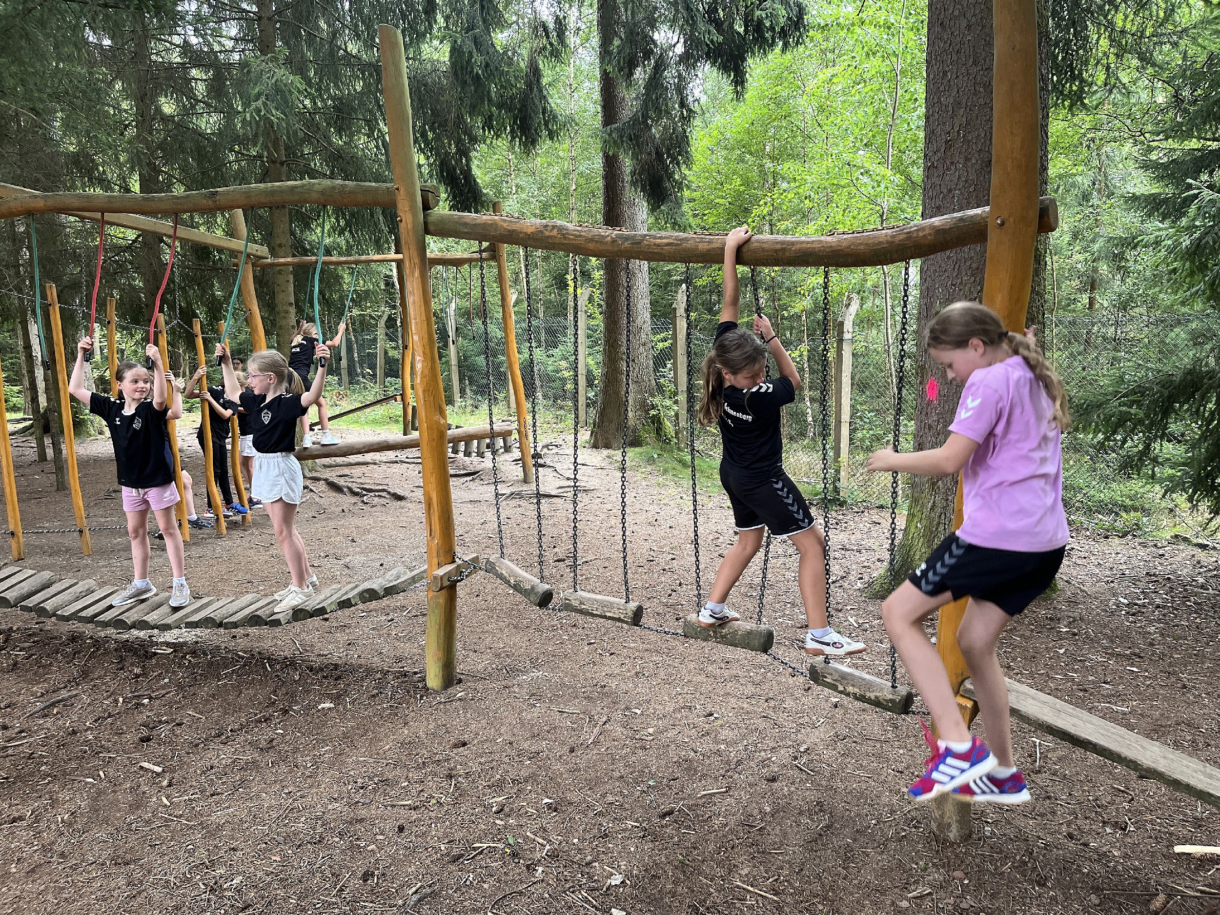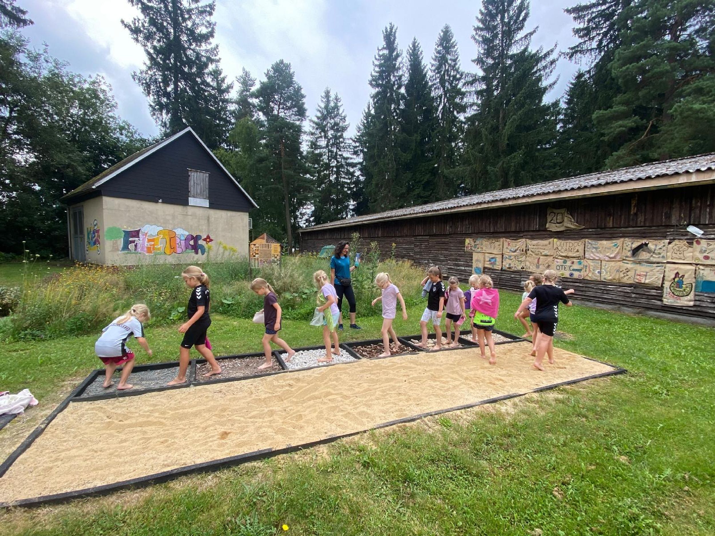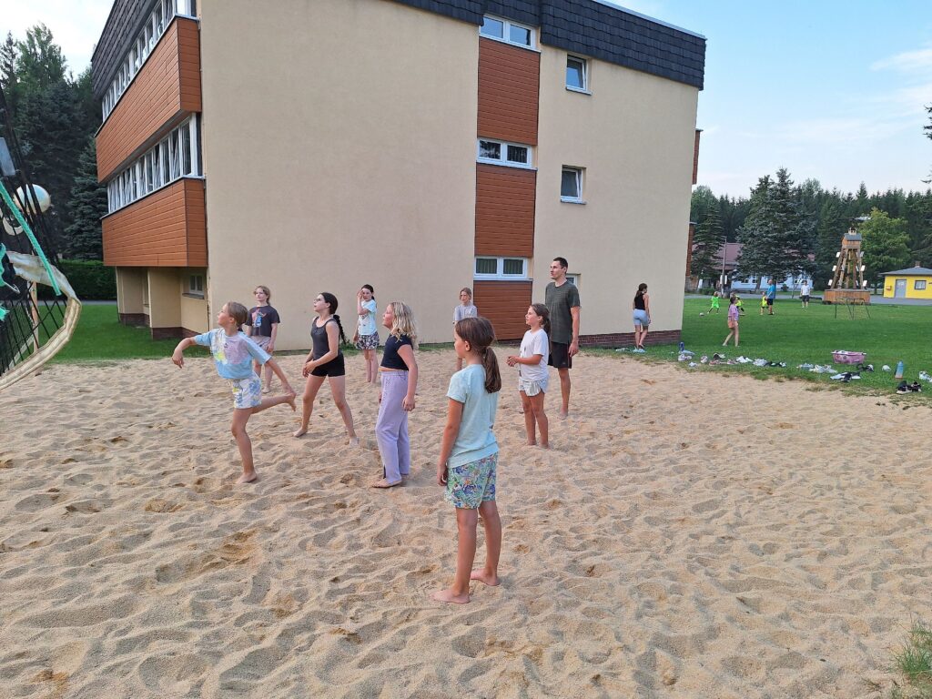 Nach dem gemeinsamen Mittagessen folgte eine kleine Ruhephase mit Meditation und Musik, ehe es erneut sportlich weiterging. Auf dem Außengelände zeigten die Mädchen Mut und Geschick im Kletterparcours, tobten auf dem Spielplatz, spielten Boccia und absolvierten auf dem Sportplatz Sprints, Hürdenläufe sowie Wurfübungen. Am Nachmittag stand zudem Entspannung am Filzteich auf dem Plan: Füße ins Wasser, Sandburgen bauen, Edelsteine sammeln – und wer noch Energie hatte, wagte sich an Slackline und Affenschaukel.