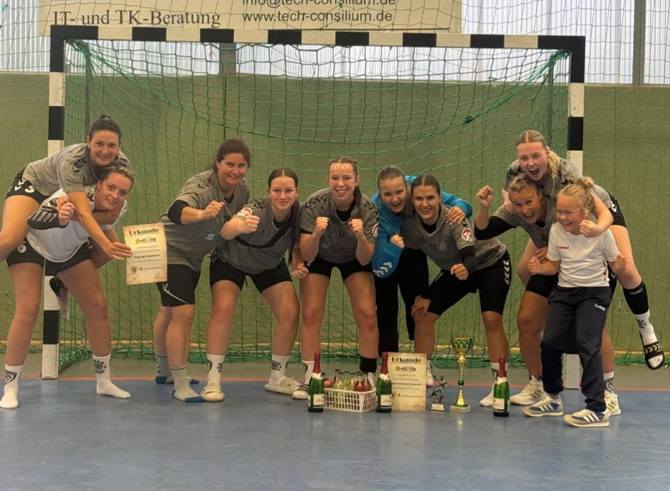 Der Spieltag in der Sporthalle Zwönitz startete mit einem 18:13 gegen den SV 04 Plauen-Oberlosa e.V., danach folgte ein klarer 24:17-Erfolg gegen den Burgstädter HC e.V.. Im dritten Spiel setzten sich unsere Frauen mit 18:14 auch gegen den HC Glauchau/Meerane e.V. durch. Erst im letzten Duell unterlagen wir dem Gastgeber Zwönitzer HSV 1928 e.V. knapp mit 17:19 – in der Endabrechnung reichte die beste Tordifferenz des Feldes dennoch zum 1. Platz. Zudem erhielt unsere Justine Ach – wie auch im Vorjahr – die Auszeichnung als beste Spielerin des Turniers. Glückwunsch dazu!