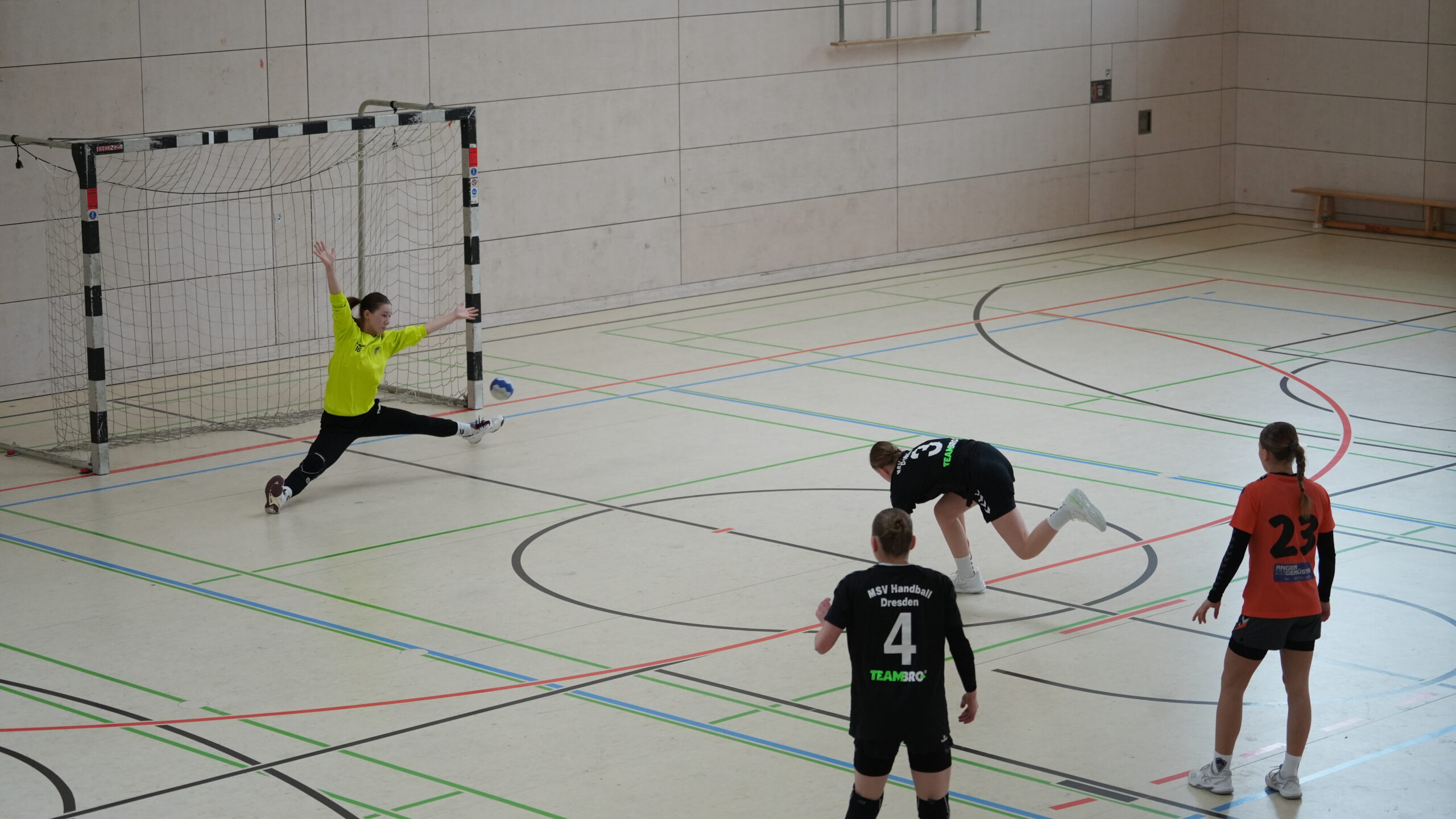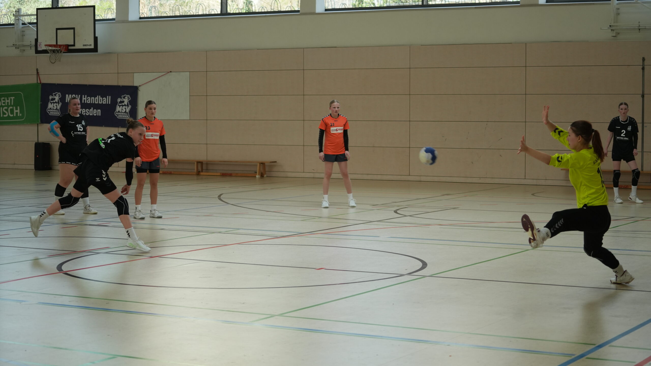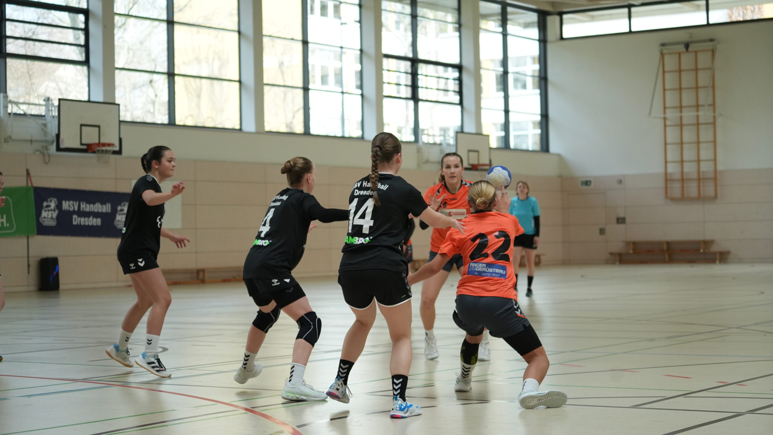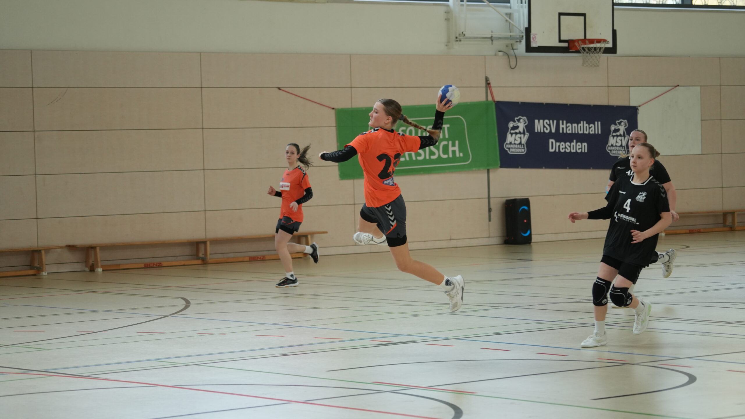Der Beginn des Spiels verlief gleich nach dem Geschmack der Trainerbank, drei Minuten waren gespielt und wir führten direkt mit 0:3. Erst danach kam der MSV zu seinem ersten hart erkämpften Tor, denn unsere Abwehr und auch unsere Torhüterin erwischten größtenteils einen guten Tag. Zwar kam der MSV in den weiteren Minuten besser ins Spiel, jedoch setzten wir uns bis zur 14. Minute mit 6 Toren ab (5:11). Wir konnten nun durchwechseln und auch andere Abwehrformationen ausprobieren. Nur Einzelleistungen der Dresdner Leistungsträger konnten uns in der 1. Halbzeit gefährlich werden, so zeigte die Anzeigetafel zur Halbzeit einen beruhigenden Spielstand von 12:18.
