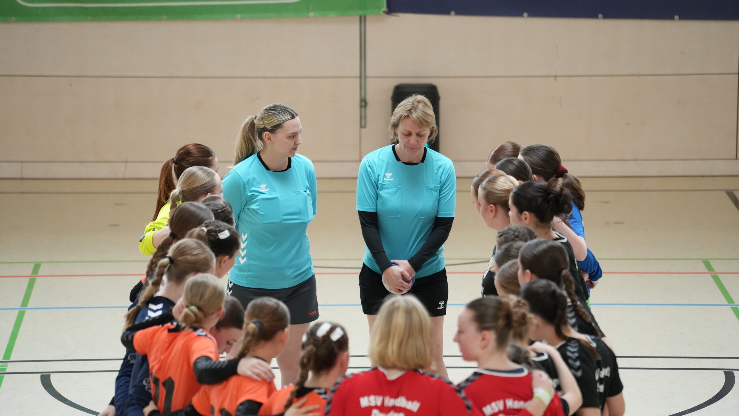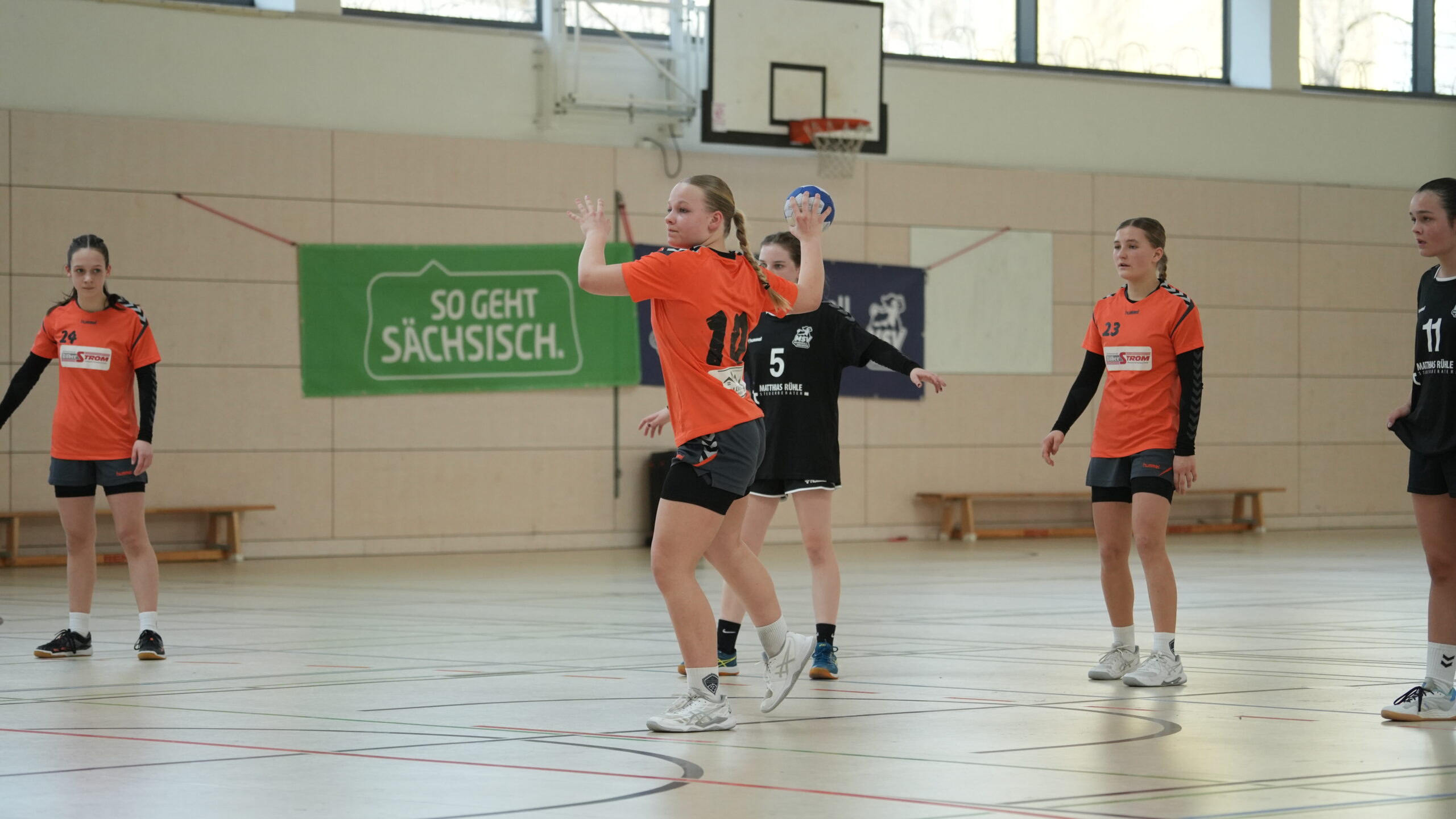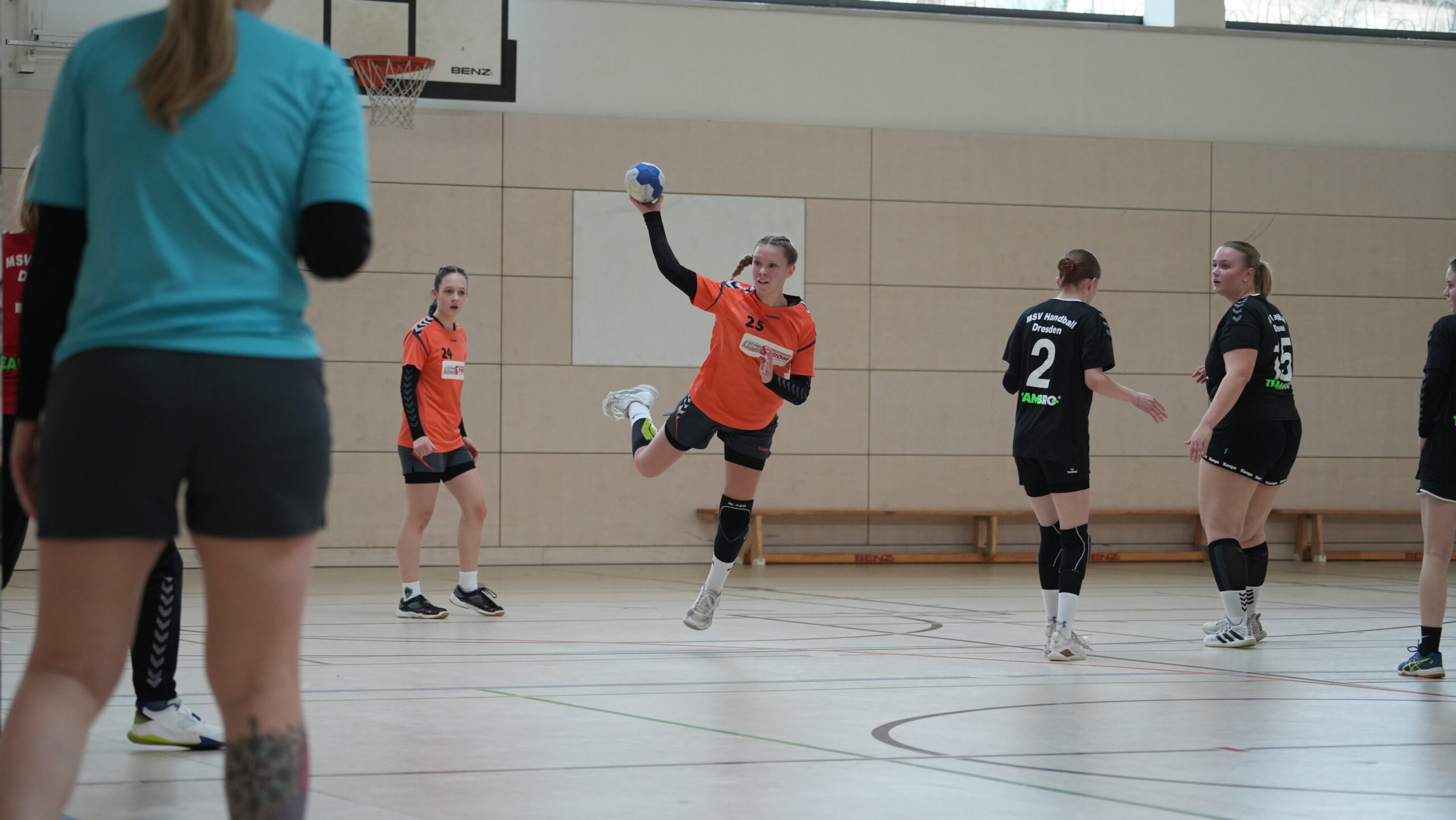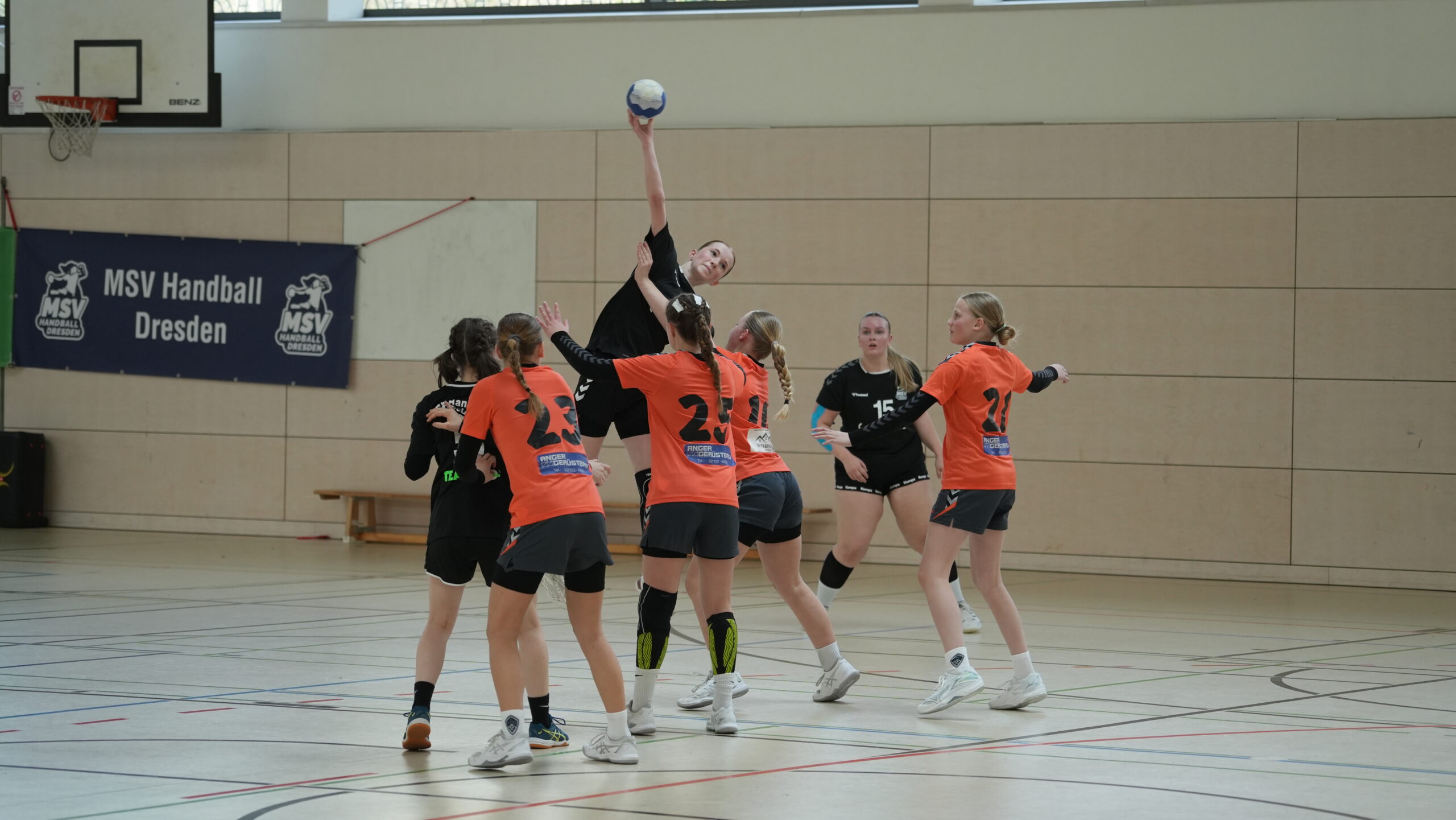 Der Beginn des Spiels verlief gleich nach dem Geschmack der Trainerbank, drei Minuten waren gespielt und wir führten direkt mit 0:3. Erst danach kam der MSV zu seinem ersten hart erkämpften Tor, denn unsere Abwehr und auch unsere Torhüterin erwischten größtenteils einen guten Tag. Zwar kam der MSV in den weiteren Minuten besser ins Spiel, jedoch setzten wir uns bis zur 14. Minute mit 6 Toren ab (5:11). Wir konnten nun durchwechseln und auch andere Abwehrformationen ausprobieren. Nur Einzelleistungen der Dresdner Leistungsträger konnten uns in der 1. Halbzeit gefährlich werden, so zeigte die Anzeigetafel zur Halbzeit einen beruhigenden Spielstand von 12:18.