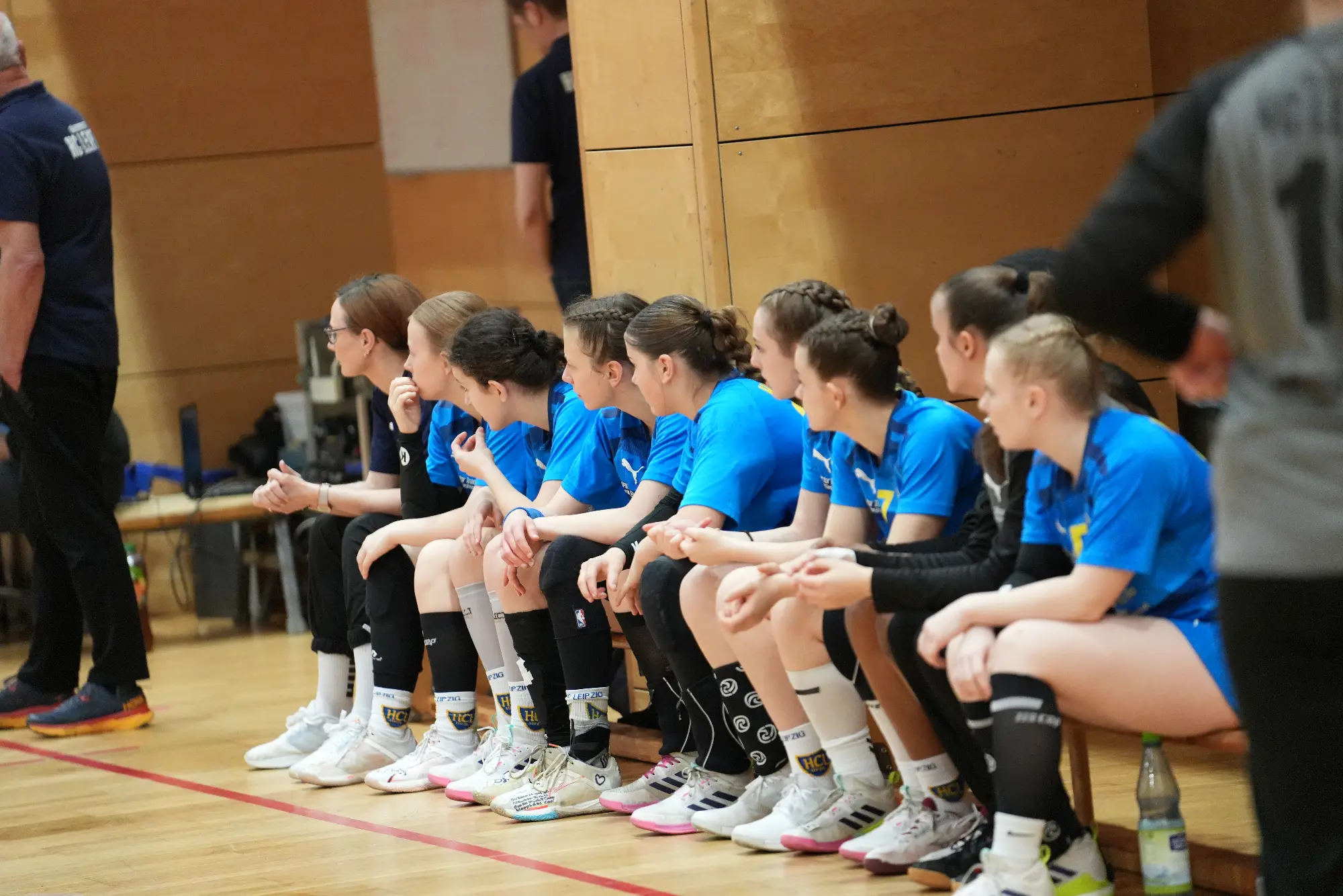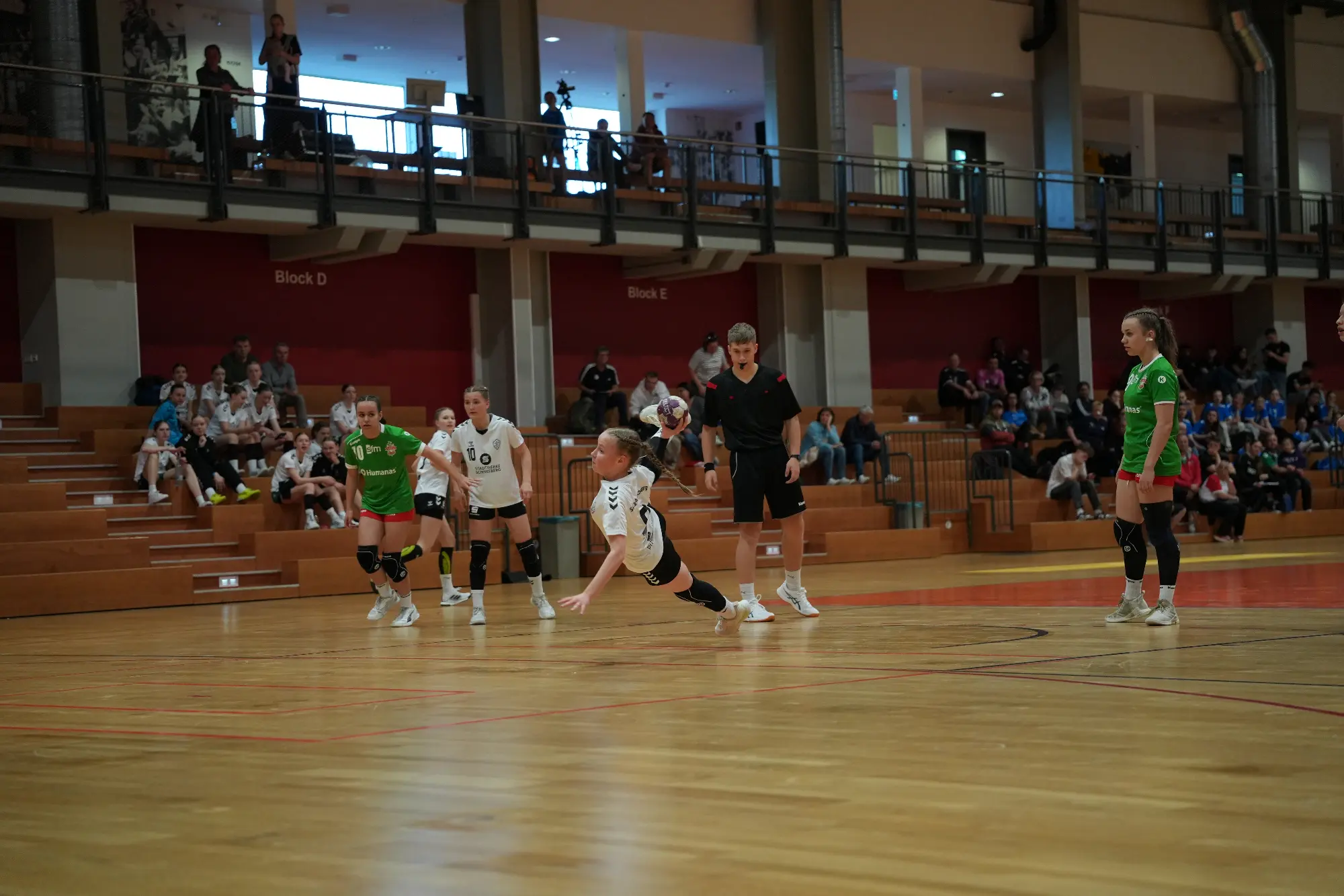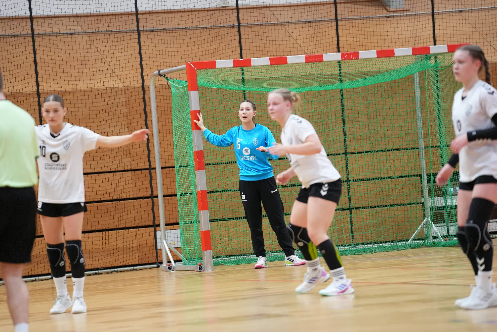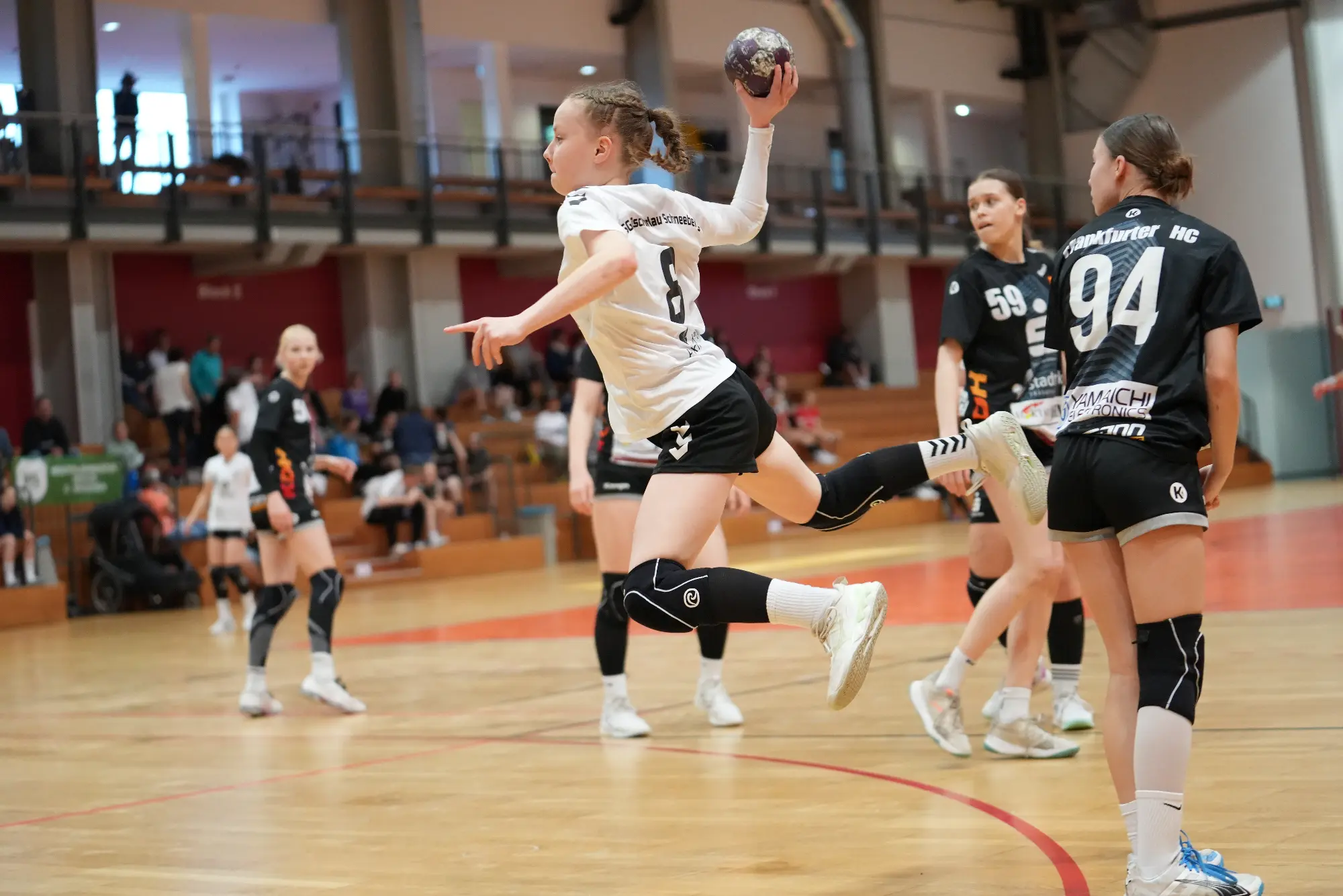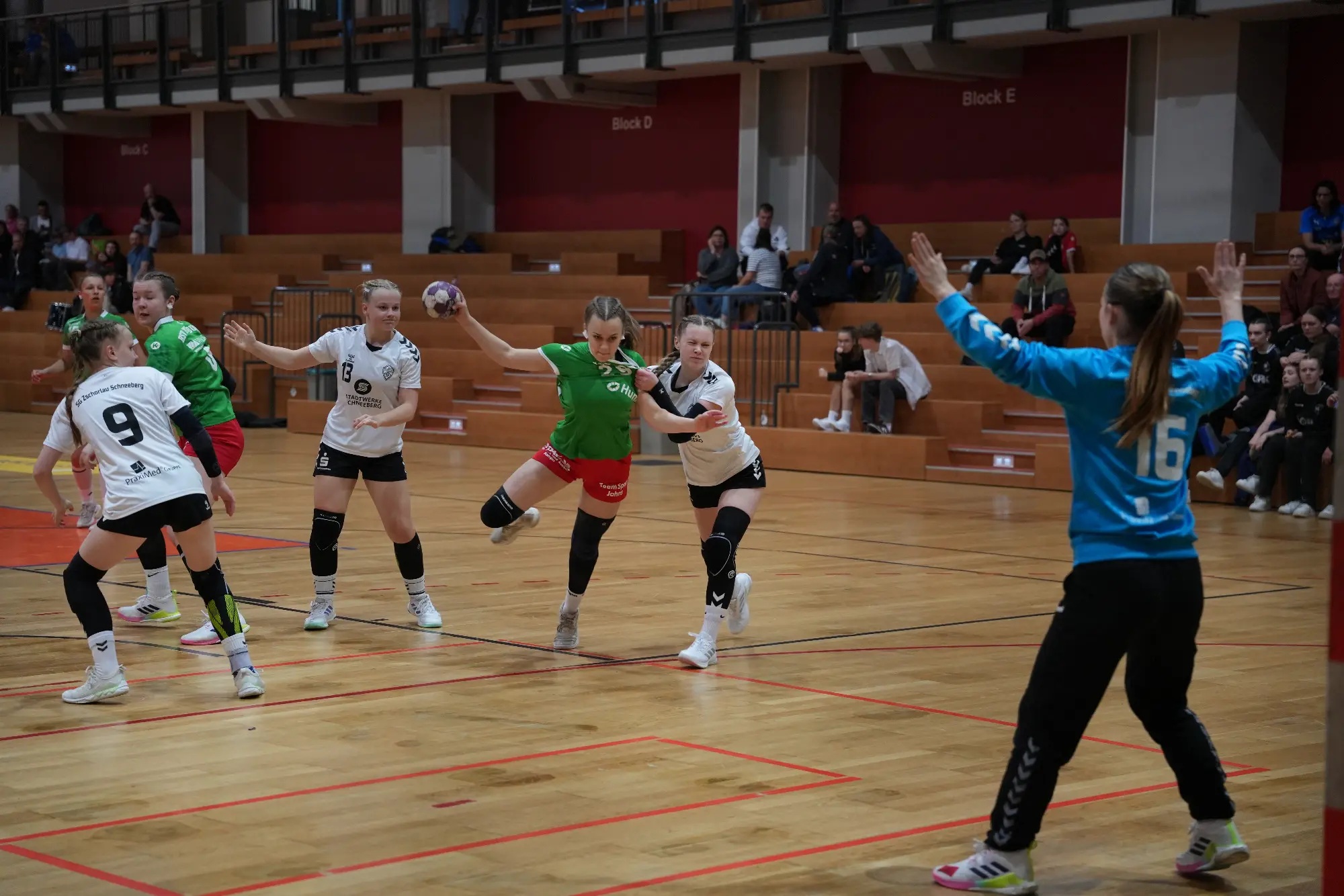 Ausgeruht und neu fokussiert startete unser Team am Mittwochmorgen ins dritte Vorrundenspiel gegen den HC Erlangen. Was folgte, war ein Handball-Krimi auf Augenhöhe. Keine der beiden Mannschaften konnte sich im Verlauf der 25 Minuten entscheidend absetzen. Tore und Führungen wechselten im Minutentakt. In der Schlussphase stand die Halle Kopf: Beim Stand von 14:13 für unser Team warfen die Erlangerinnen noch einmal alles nach vorn. Doch dank einer kämpferischen Abwehrleistung und einer herausragenden Lara Haase im Tor, retteten unsere Mädels den knappen 14:13-Sieg über die Zeit. Der Jubel nach dem Schlusspfiff war riesig – dieser hart erkämpfte Sieg hielt die Halbfinalträume am Leben und zeigte die großartige Moral der Mannschaft.
