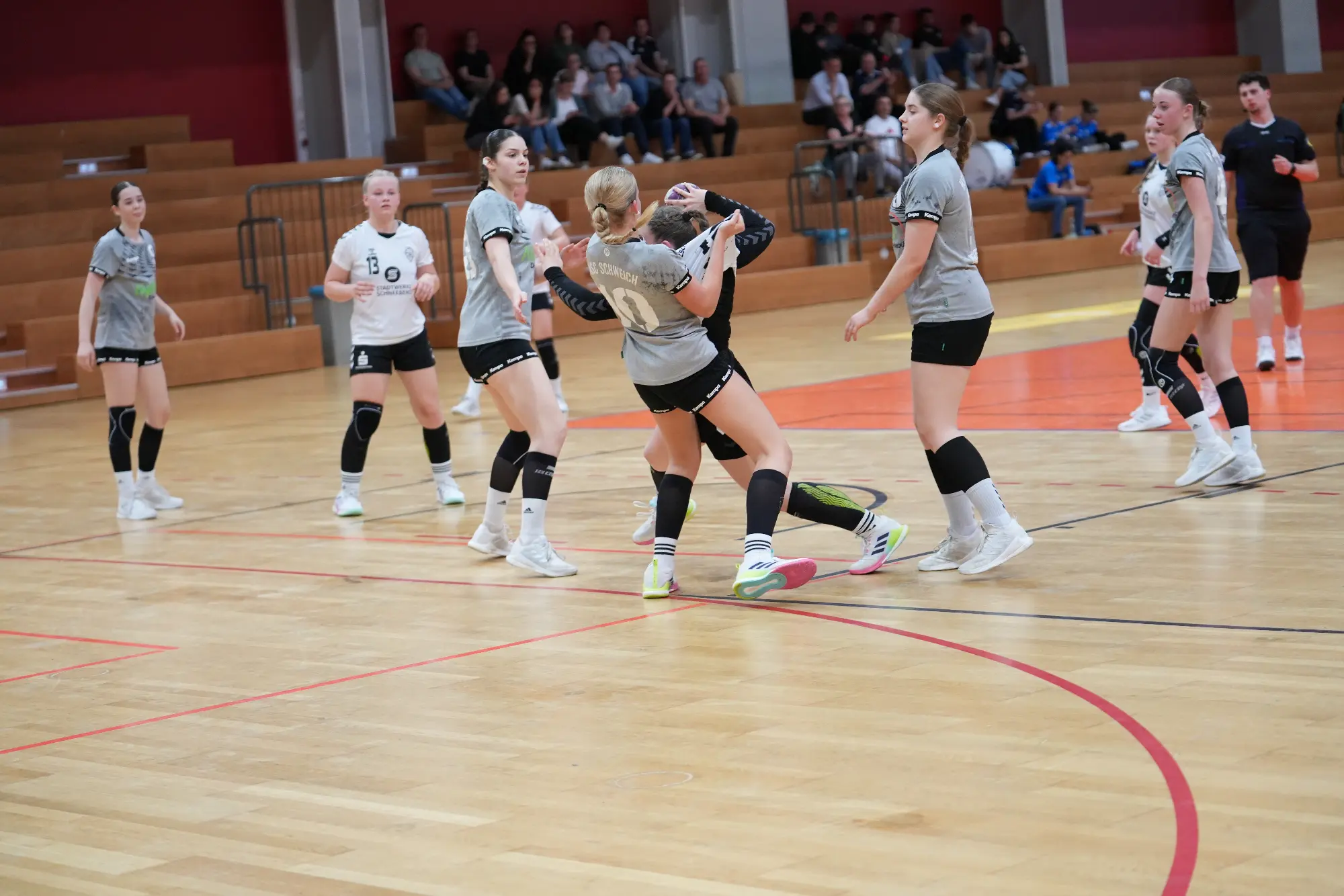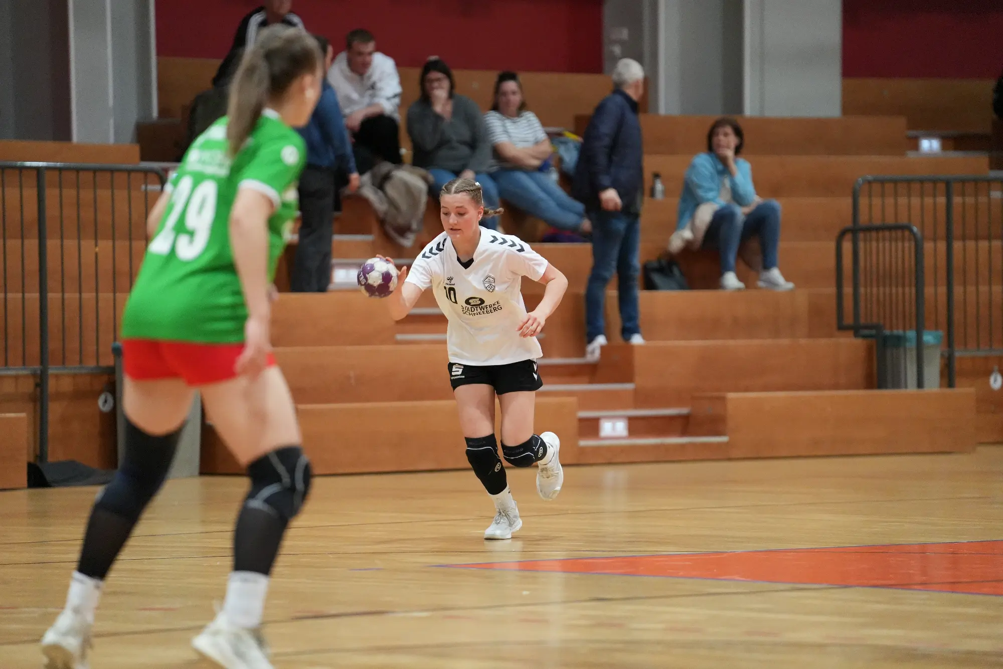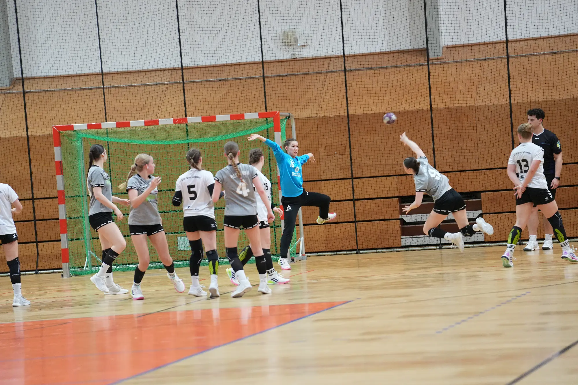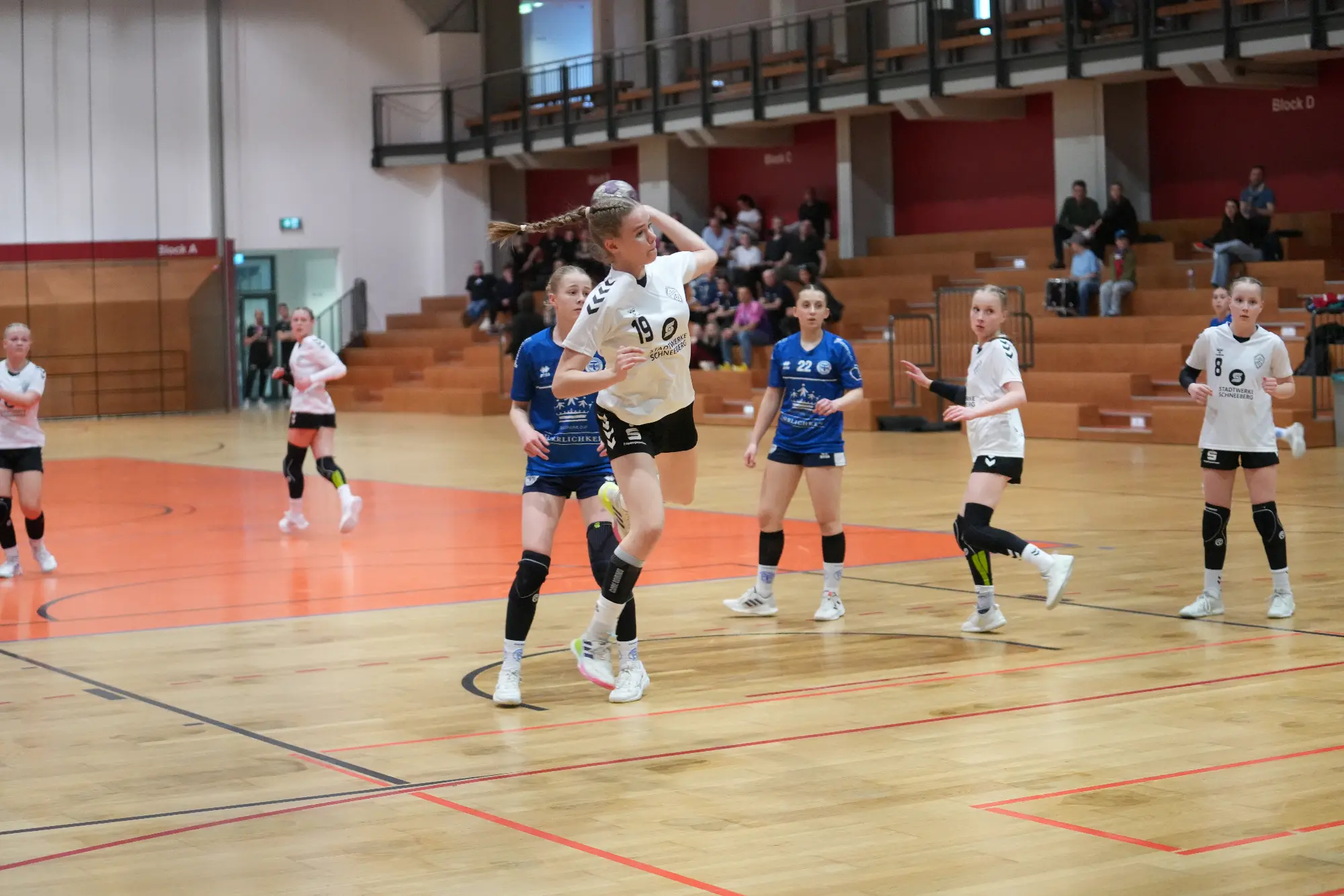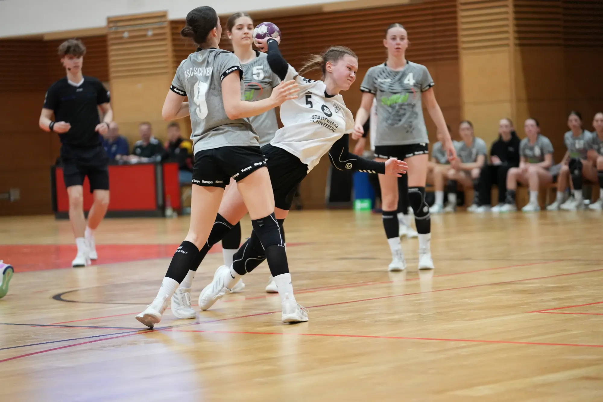 Ausgeruht und neu fokussiert startete unser Team am Mittwochmorgen ins dritte Vorrundenspiel gegen den HC Erlangen. Was folgte, war ein Handball-Krimi auf Augenhöhe. Keine der beiden Mannschaften konnte sich im Verlauf der 25 Minuten entscheidend absetzen. Tore und Führungen wechselten im Minutentakt. In der Schlussphase stand die Halle Kopf: Beim Stand von 14:13 für unser Team warfen die Erlangerinnen noch einmal alles nach vorn. Doch dank einer kämpferischen Abwehrleistung und einer herausragenden Lara Haase im Tor, retteten unsere Mädels den knappen 14:13-Sieg über die Zeit. Der Jubel nach dem Schlusspfiff war riesig – dieser hart erkämpfte Sieg hielt die Halbfinalträume am Leben und zeigte die großartige Moral der Mannschaft.