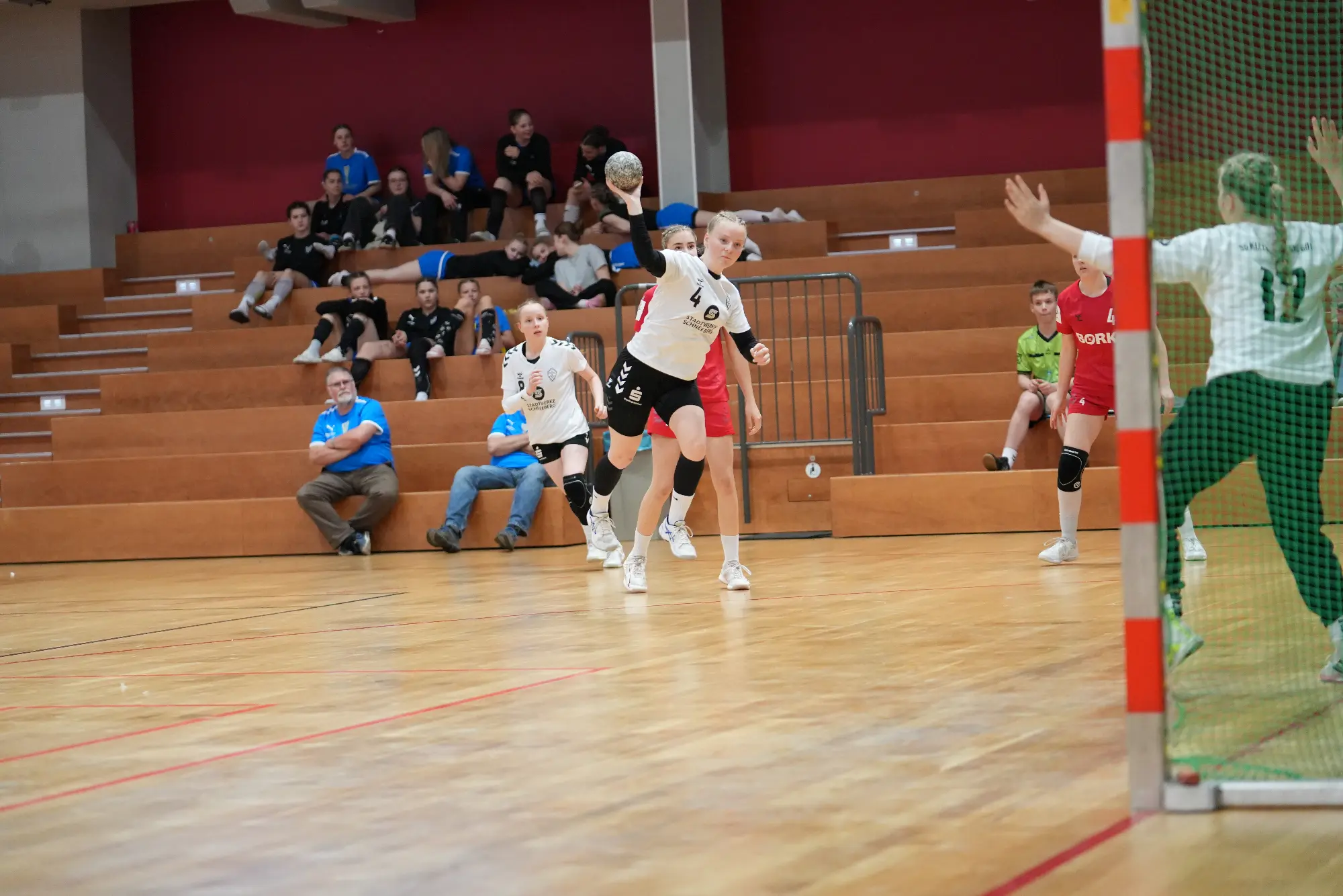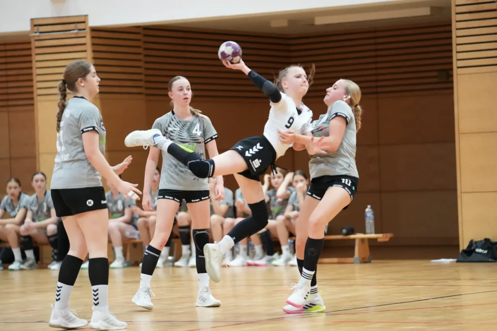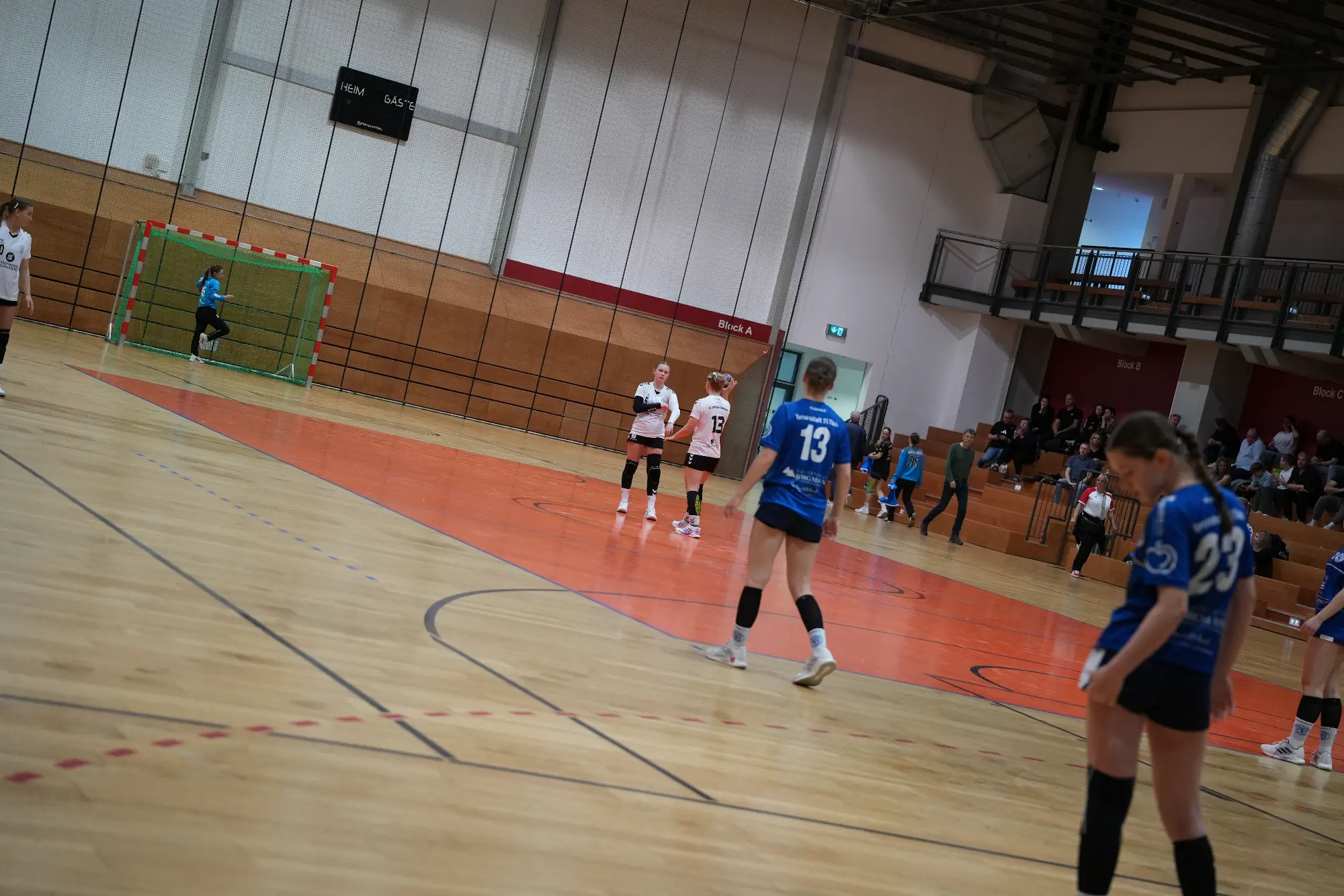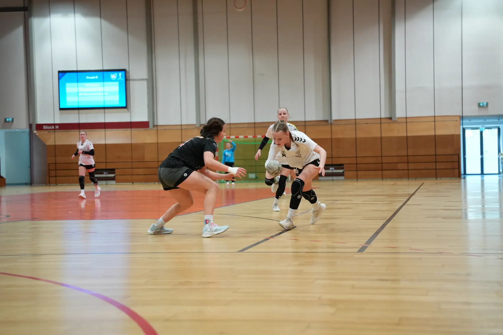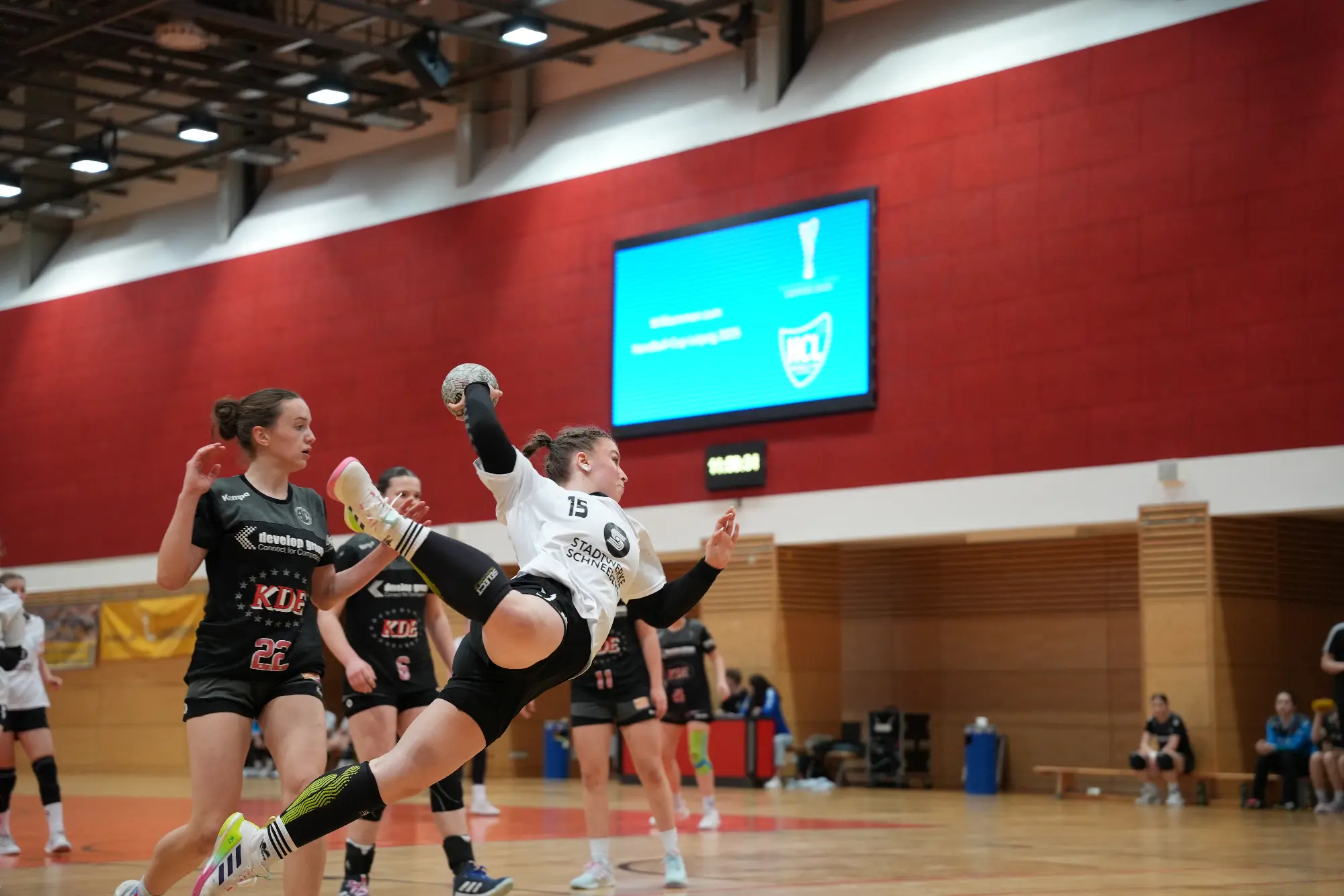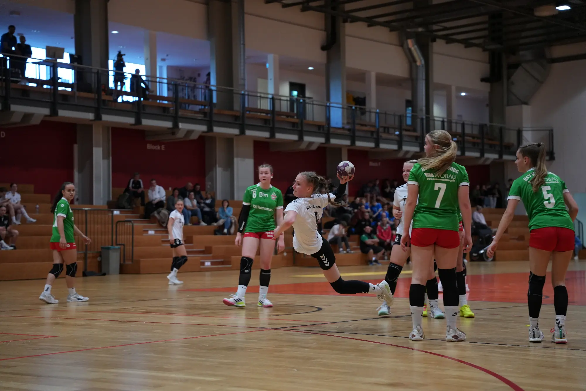 Ausgeruht und neu fokussiert startete unser Team am Mittwochmorgen ins dritte Vorrundenspiel gegen den HC Erlangen. Was folgte, war ein Handball-Krimi auf Augenhöhe. Keine der beiden Mannschaften konnte sich im Verlauf der 25 Minuten entscheidend absetzen. Tore und Führungen wechselten im Minutentakt. In der Schlussphase stand die Halle Kopf: Beim Stand von 14:13 für unser Team warfen die Erlangerinnen noch einmal alles nach vorn. Doch dank einer kämpferischen Abwehrleistung und einer herausragenden Lara Haase im Tor, retteten unsere Mädels den knappen 14:13-Sieg über die Zeit. Der Jubel nach dem Schlusspfiff war riesig – dieser hart erkämpfte Sieg hielt die Halbfinalträume am Leben und zeigte die großartige Moral der Mannschaft.
