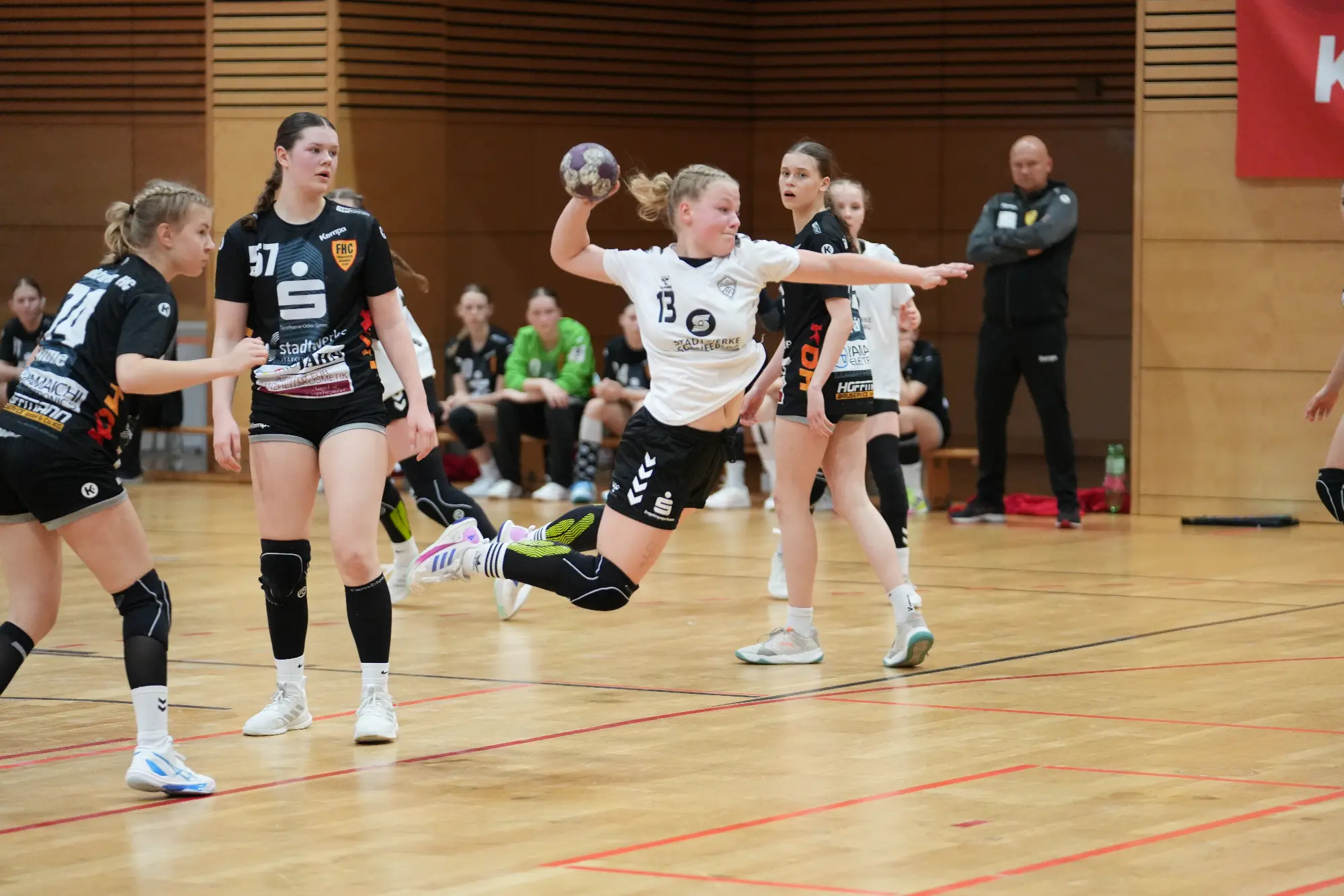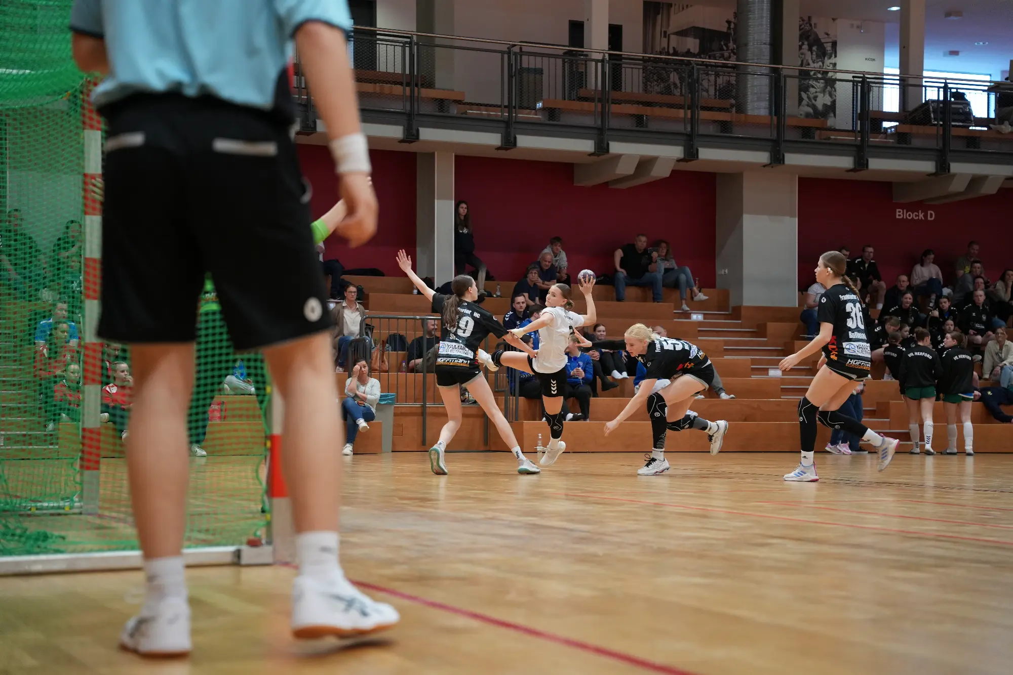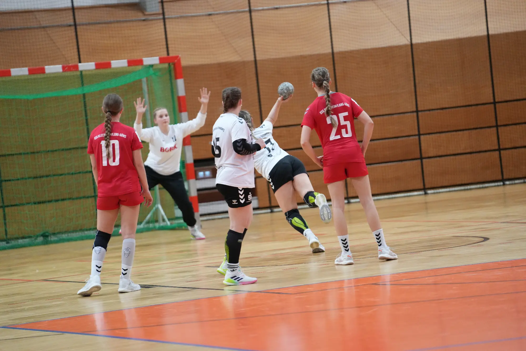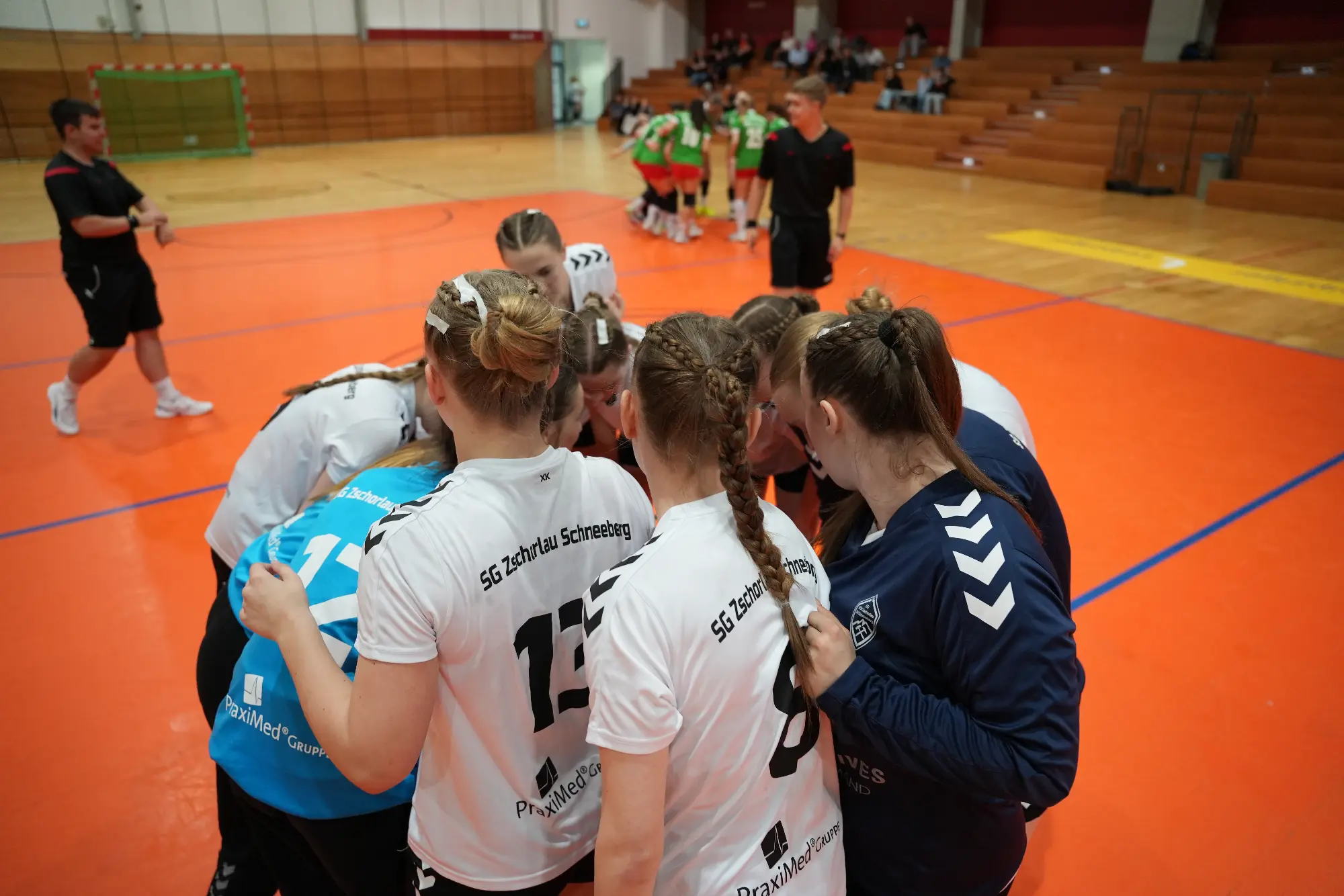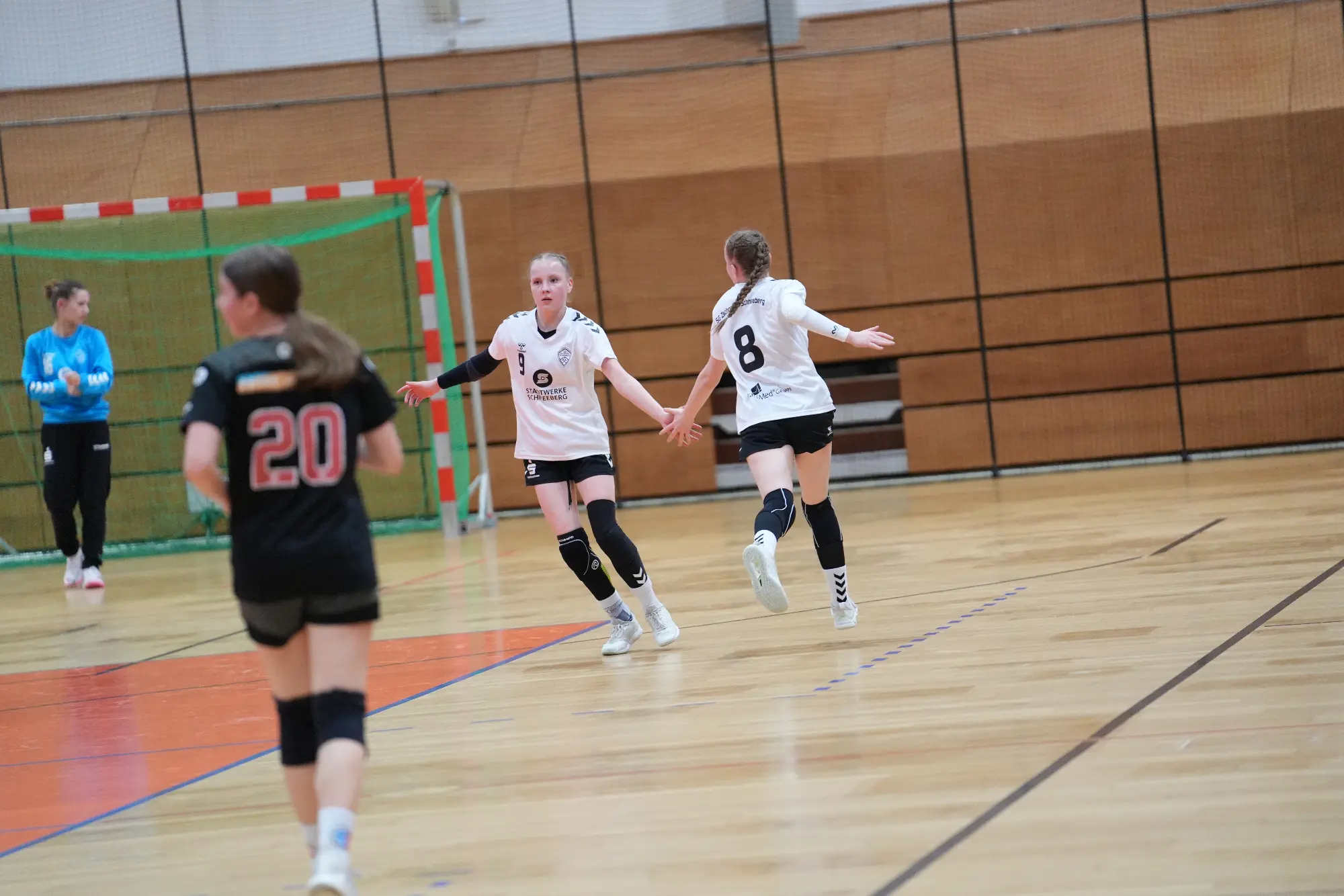 Ausgeruht und neu fokussiert startete unser Team am Mittwochmorgen ins dritte Vorrundenspiel gegen den HC Erlangen. Was folgte, war ein Handball-Krimi auf Augenhöhe. Keine der beiden Mannschaften konnte sich im Verlauf der 25 Minuten entscheidend absetzen. Tore und Führungen wechselten im Minutentakt. In der Schlussphase stand die Halle Kopf: Beim Stand von 14:13 für unser Team warfen die Erlangerinnen noch einmal alles nach vorn. Doch dank einer kämpferischen Abwehrleistung und einer herausragenden Lara Haase im Tor, retteten unsere Mädels den knappen 14:13-Sieg über die Zeit. Der Jubel nach dem Schlusspfiff war riesig – dieser hart erkämpfte Sieg hielt die Halbfinalträume am Leben und zeigte die großartige Moral der Mannschaft.
