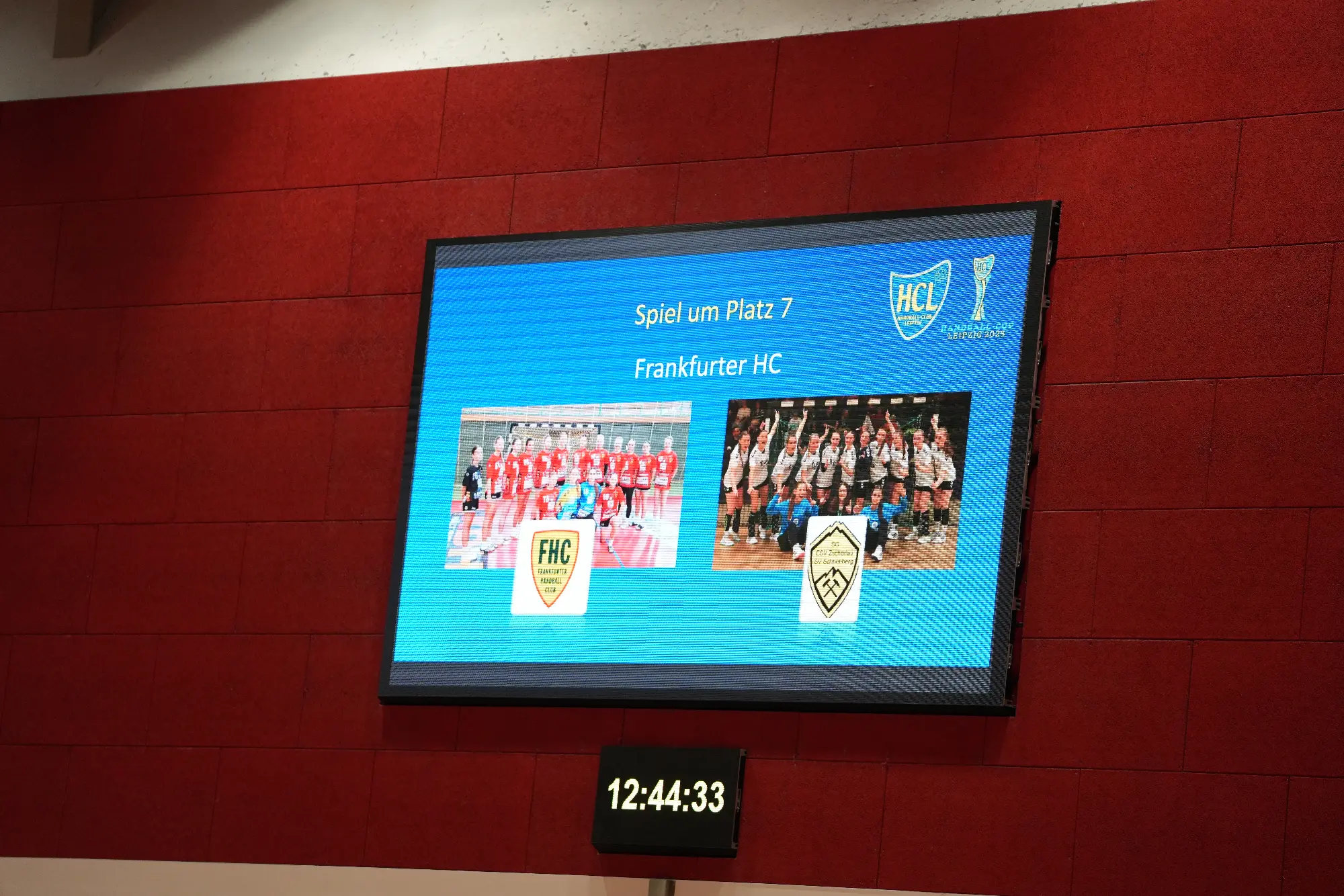 Im abschließenden Spiel um Platz 7 traf die SG Zschorlau/Schneeberg nur wenig später auf den Frankfurter HC. Trotz der Strapazen der vorherigen Tage mobilisierten unsere Spielerinnen noch einmal all ihre Kräfte. Niemand wollte das Turnier mit einer Niederlage beenden und von Anfang an merkte man dem Team den unbedingten Siegeswillen an. Die Abwehr agierte aufmerksam und zwang Frankfurt zu Fehlern, während im Angriff endlich wieder das gewohnte Kombinationsspiel aufgezogen wurde. Immer wieder fand der Ball die freie Mitspielerin und diese Chancen wurden konsequent verwertet. Auch Lara knüpfte an ihre Glanzleistungen an und entschärfte unter dem Jubel der Zuschauer mehrere Würfe der Frankfurterinnen.