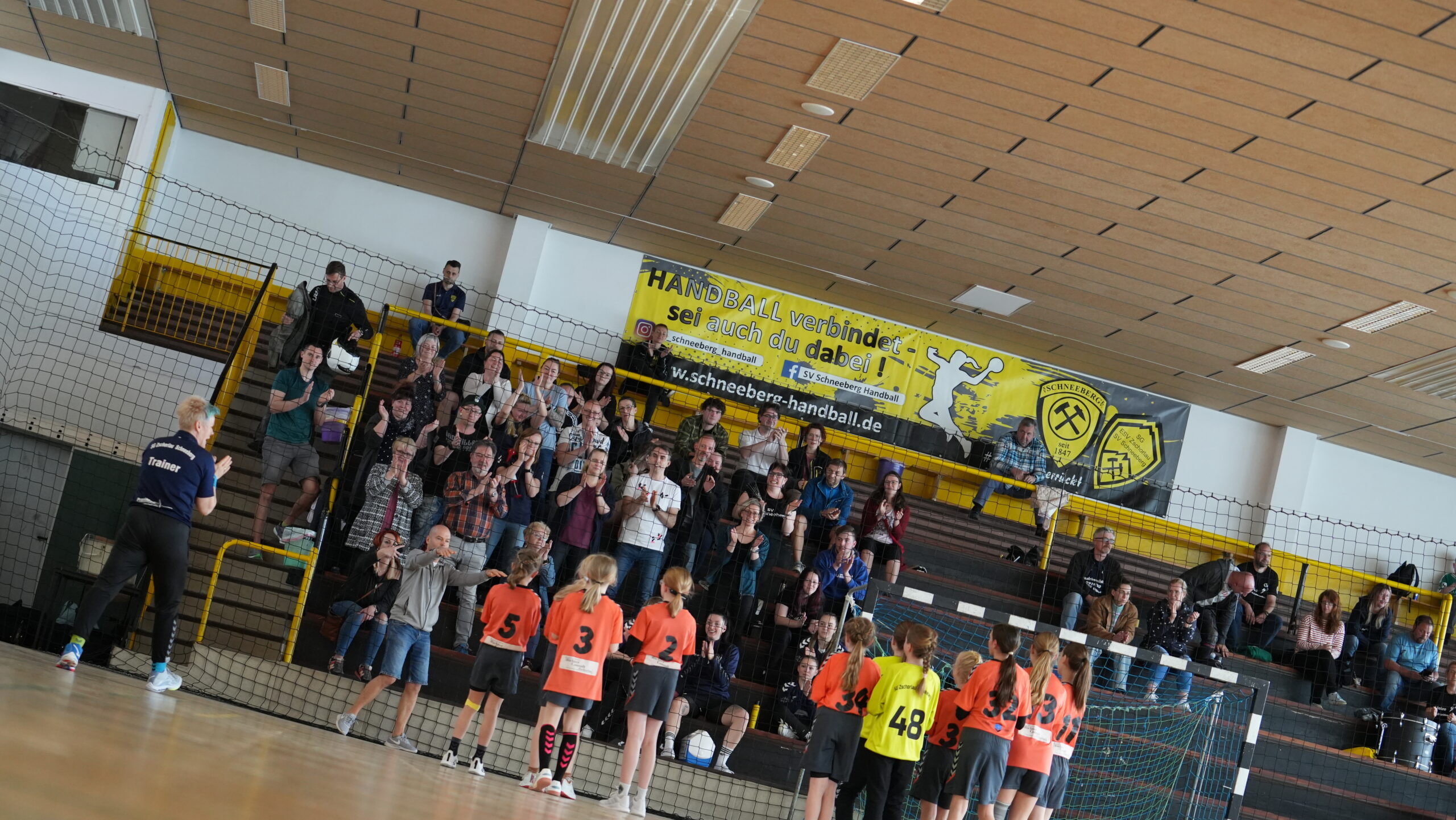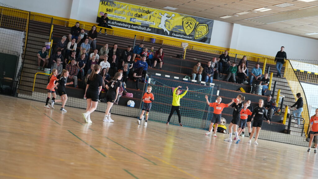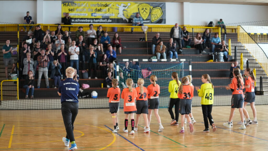 Am Sonntag fand der letzte Heimspieltag der Saison statt. Unsere D-Jugend traf auf die Mädels des Burgstädter HC. Nachdem das Hinspiel unentschieden (8:8) endete, wollte man heute den ersten Sieg vor heimischen Publikum einfahren. Die ersten Minuten gestalteten sich auf beiden sehr zäh und keine der Mannschaften fand so richtig ins Spiel. Nach 5 Minuten zog unser Trainerteam Ramschi & Annett die grüne Karte und stimmte die Mädels nochmal auf die Partie ein. Anschließend konnte die Mannschaft zeigen was in ihnen steckt und in den letzten Monaten intensiv trainiert wurde. Die Verteidigung stand sicher und ließ kaum einen Durchbruch der Gegner zu. Im Angriff allerdings tat auch Schneeberg sich anfangs schwer, fand aber immer wieder Lücken und netzte ins gegnerische Tor ein. Mit viel Kampfgeist und einer geschlossenen Mannschaftsleistung stand am Ende ein 16:11 auf der Anzeigetafel und die D-Jugend belohnte sich zum Saisonende mit ihrem ersten Sieg.
