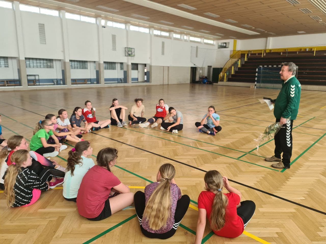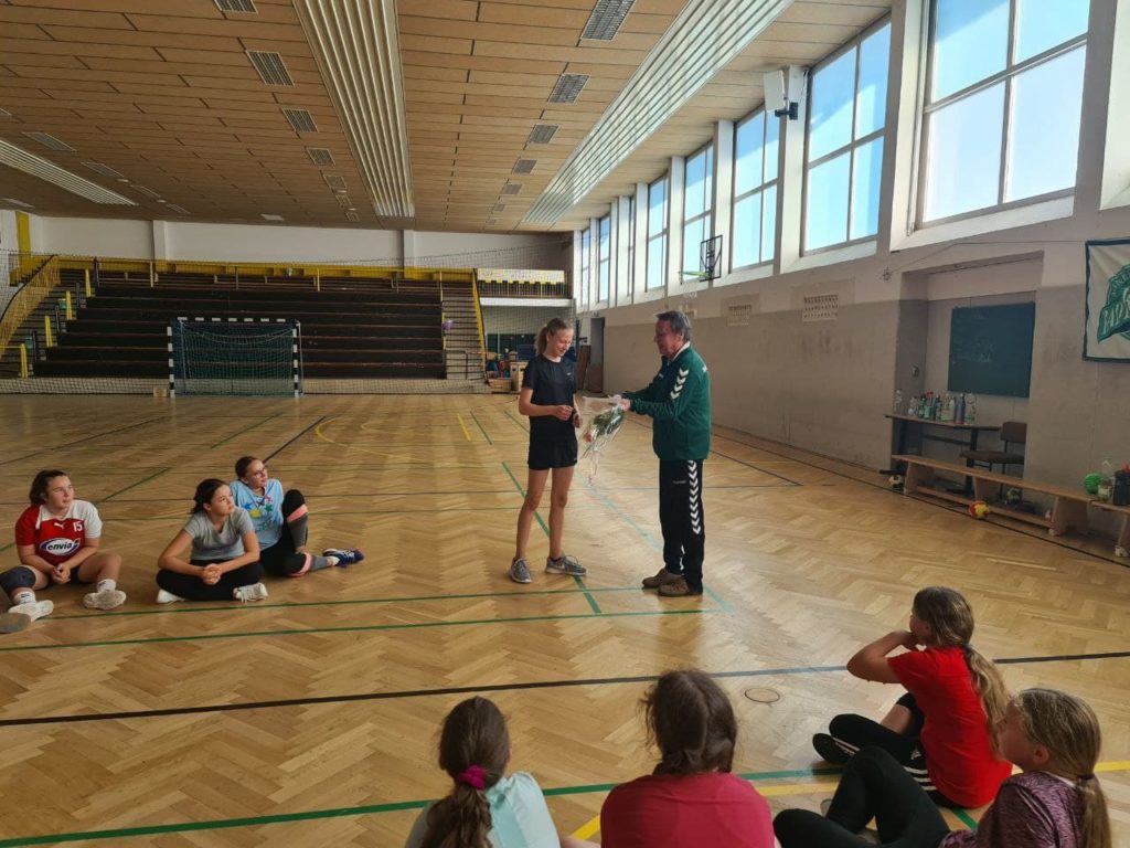 Nachdem drei unserer wD-Mädels in der letzten Sommerferienwoche am ersten Talente-Trainingslager der Bezirksauswahl teilnahmen, besuchte uns der Vorsitzende der Nachwuchskommission der Spielbezirksleitung Chemnitz Herr Pleißner in der Silberstromhalle Schneeberg. Nachdem er nur lobende Worte über Lotta, Emma und Naimi fand, teilte er uns mit, dass sich alle 3 als Stammspielerinnen für die Bezirksauswahl 09 etabliert haben.