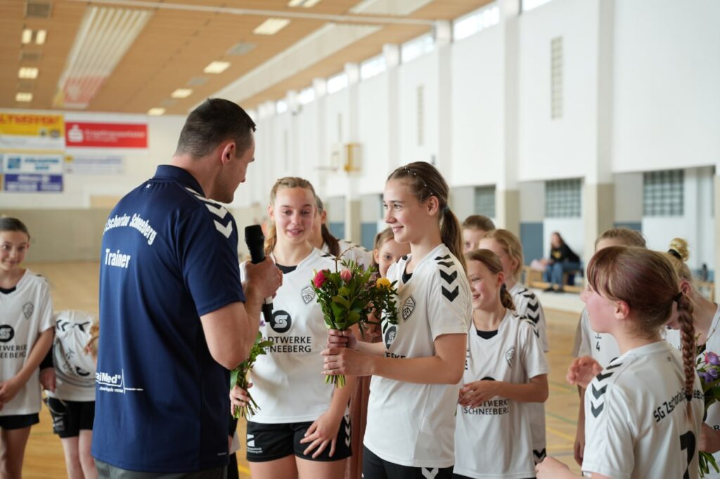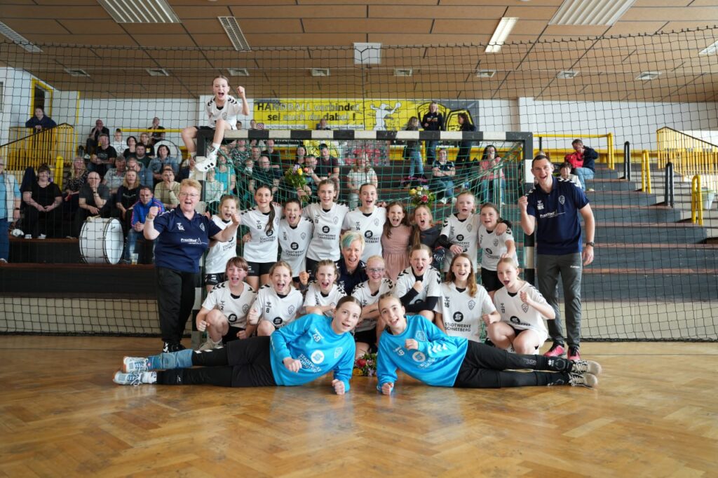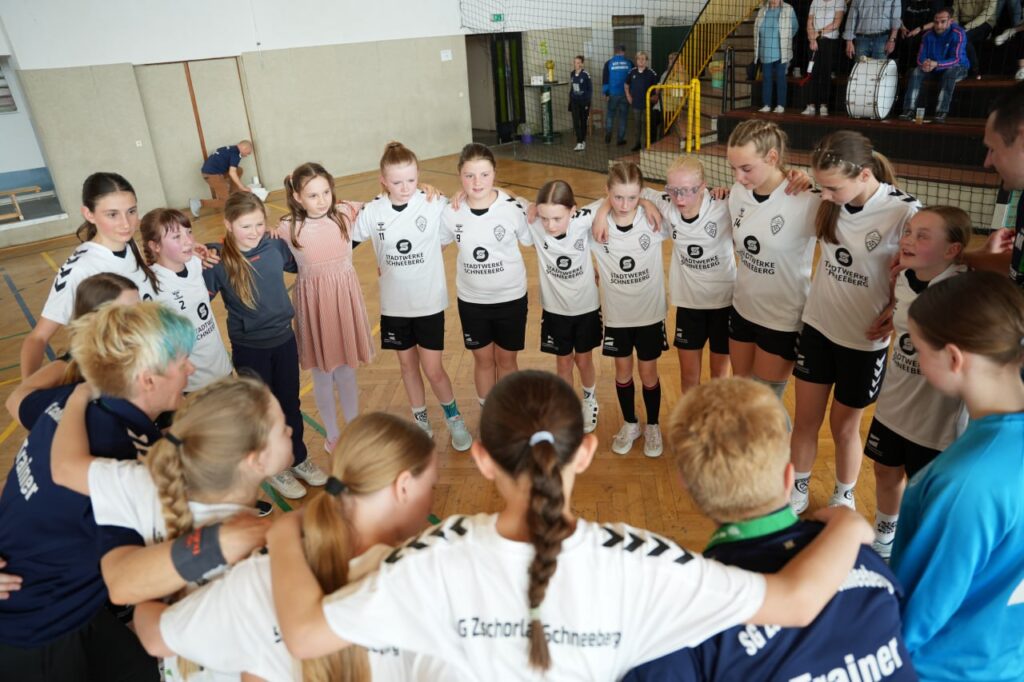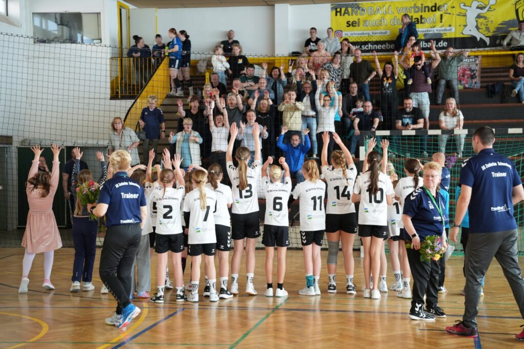 Die Meisterschaft war bereits gesichert, doch von Zurücklehnen war bei der D-Jugend der SG Zschorlau/Schneeberg keine Spur. Im letzten Heimspiel der Saison zeigte die frischgekrönte Meistermannschaft noch einmal eindrucksvoll, warum sie an der Spitze der Regionsoberliga Südwestsachsen steht. Mit einem souveränen 31:13-Erfolg gegen den HSV Marienberg verabschiedeten sich die Spielerinnen standesgemäß von ihren Fans – und krönten ihre starke Saison mit einem rundum gelungenen Auftritt. In einer vollen Halle und begleitet von lautstarker Unterstützung dominierten die Mädels von Beginn an das Geschehen. Die Mannschaft überzeugte mit Teamgeist, Tempo und Torhunger – und belohnte sich und ihr Umfeld mit einem emotionalen Saisonabschluss, der mehr war als nur ein Pflichtsieg: ein echtes Handballfest!