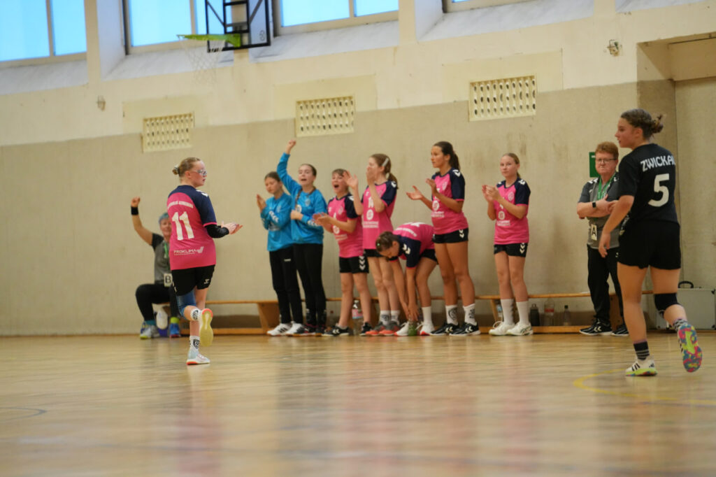 Nach dem Seitenwechsel wendete sich leider das Blatt. Zwickau kam deutlich wacher aus der Kabine, erhöhte das Tempo und agierte nun mit mehr Entschlossenheit im Angriff. Unsere Mädels verloren dagegen etwas an Struktur und leisteten sich in dieser Phase einige technische Fehler, die die Zwickauerinnen konsequent nutzten. Innerhalb weniger Minuten gelang Zwickau der Ausgleich und kurz darauf die Führung. Die Gäste spielten nun mit hohem Tempo, setzten auf schnelle Gegenstöße und nutzten unsere Ballverluste eiskalt aus. Während wir zunehmend Schwierigkeiten hatten, uns gegen die kompakte Abwehr durchzusetzen, traf Zwickau fast nach Belieben. Mit zunehmender Spielzeit ließ die Durchschlagskraft unserer Mädels nach, während die Gäste ihre Routine und Überlegenheit ausspielten. Der Spielfluss kam ins Stocken, und trotz großer kämpferischer Bemühungen gelang es nicht mehr, den Anschluss zu halten. Zwickau kontrollierte nun klar das Geschehen und baute den Vorsprung Tor um Tor aus. Am Ende stand eine deutliche 18:28-Niederlage, die den Verlauf der zweiten Halbzeit widerspiegelt. Trotz des klaren Endergebnisses zeigte unsere D-Jugend phasenweise eine ansprechende starke Leistung und bewies, dass sie auch gegen starke Gegner mithalten kann.