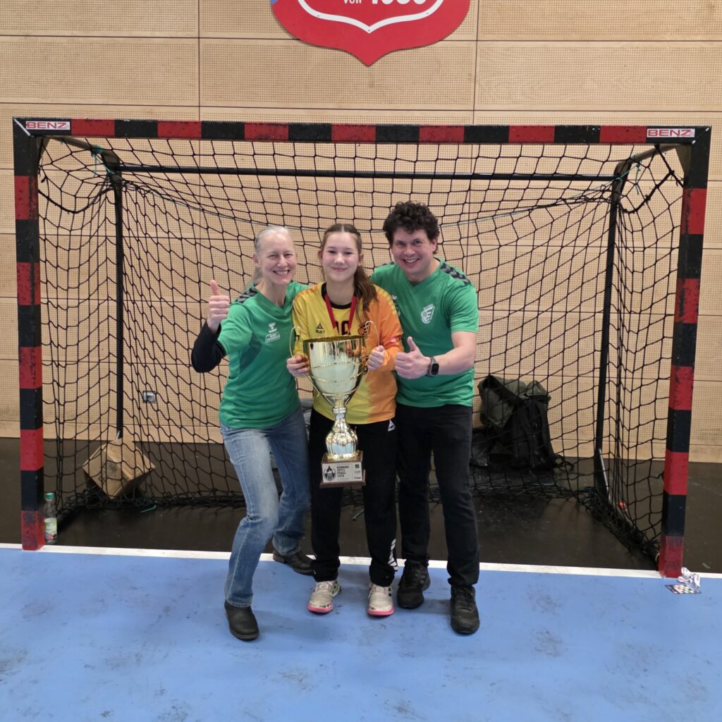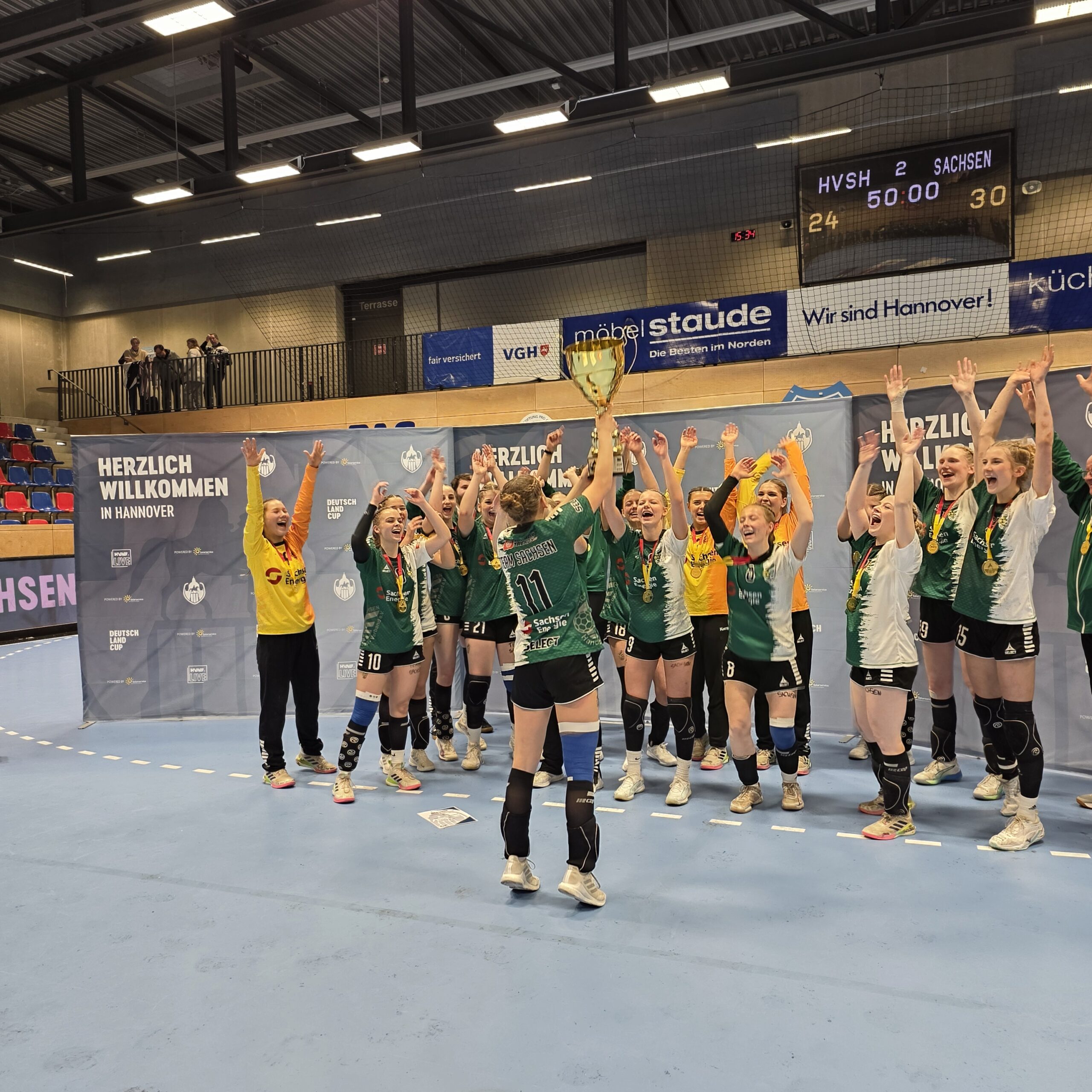 Aus sächsischer Sicht standen zudem zwei Spielerinnen besonders im Fokus, die in ihrer handballerischen Entwicklung eng mit unserer SG verbunden sind: Lara Haase und Nele Wimmer, beide ehemals im Trikot der SG Zschorlau Schneeberg aktiv und mittlerweile Leistungsträgerinnen im Jugendbundesligakader des HC Leipzig. Beide trugen maßgeblich zum Turniersieg des HV Sachsen bei. Lara Haase ragte dabei besonders heraus: Mit konstant starken Leistungen stellte sie die beste Torhüterin des Turniers und wurde am Ende verdient in das All-Star-Team des Deutschland Cups gewählt. Eine herausragende Auszeichnung, die ihre Entwicklung eindrucksvoll bestätigt.