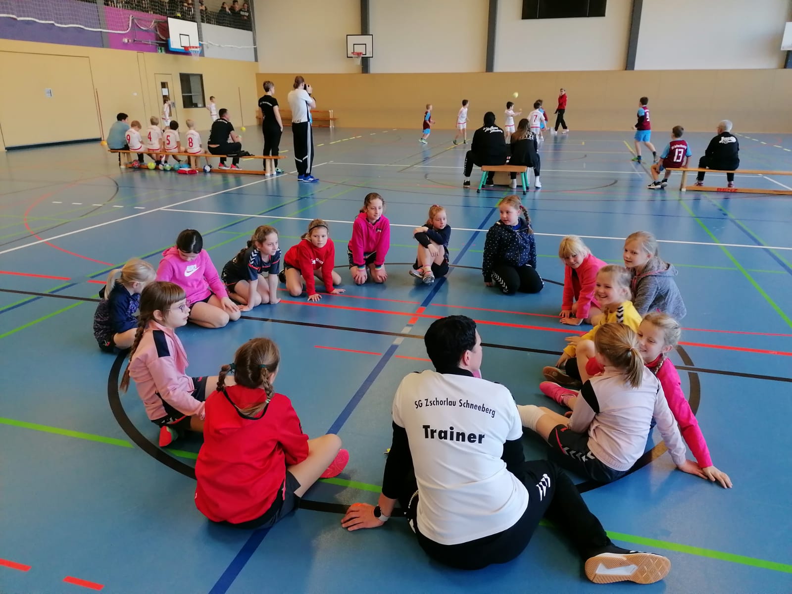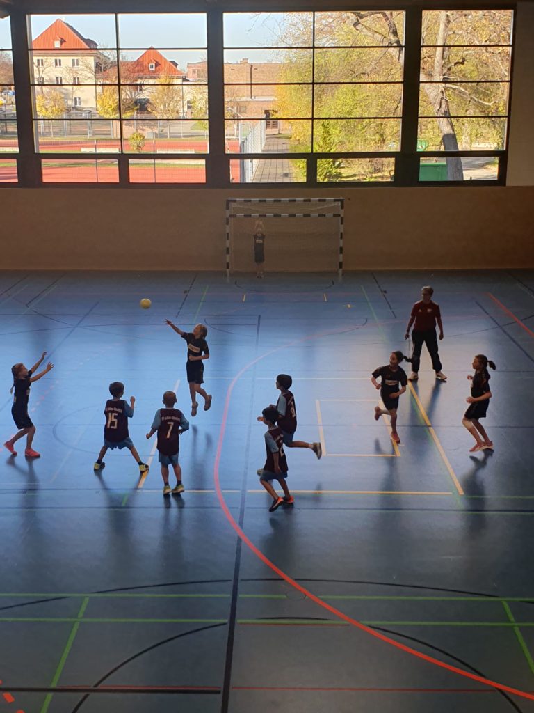 Am Sonntag, den 13.11.2022 starteten wir mit 14 Mädels der F-Jugend zum ersten Miniliga-Turnier nach Zwickau. Alle Mädels waren etwas aufgeregt, aber als es an die Verteilung der schicken Spielertrikots ging, war die Vorfreude geweckt. Auf dem Programm standen 3 Spiele Aufsetzerball und 3 Spiele Minihandball, sodass alle 14 Mädels zum Einsatz kamen. Das 1. Spiel Aufsetzerball gegen SG Oberland ging knapp mit 3:2 verloren. Im 2. Spiel traten wir gegen SV Aufbau Altenburg I an, die eine reine Jungsmannschaft waren. Trotz Kampfgeist gegen körperlich überlegene Thüringer ging das Spiel 10:0 verloren. Für alle beteiligten Spieler*innen gab es noch einen 30-Sekunden-Sprungseiltest. Am besten schnitten unsere 2 Mädels Esraa und Noa ab. Das 3. Spiel gegen SV Aufbau Altenburg ging leider auch knapp mit 3:2 verloren. In den 3 weiteren Spielen Minihandball hatten sich unsere Mädels warm gespielt. Gegen HV Chemnitz siegten wir 2:1. Gegen die starken Thüringer Jungs verloren wir 6:2. Im letzten Spiel des Tages gegen MSG Zwickau I wurde rege ausgewechselt und die Mädels erkämpften sich mit einer tollen Teamleistung einen 5:3 Sieg. Die mitgereisten Eltern brachten die Empore vor Begeisterung zum beben.
