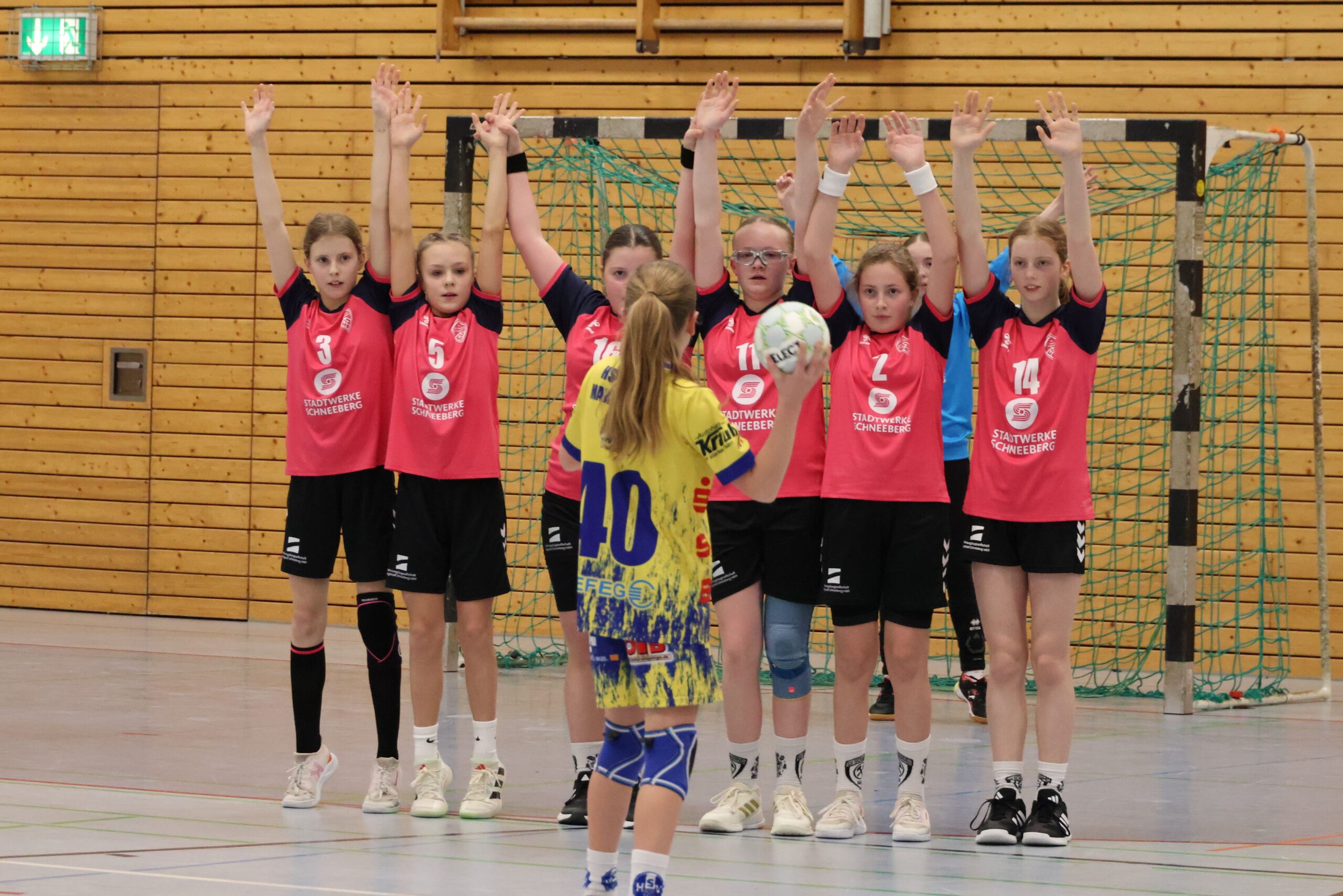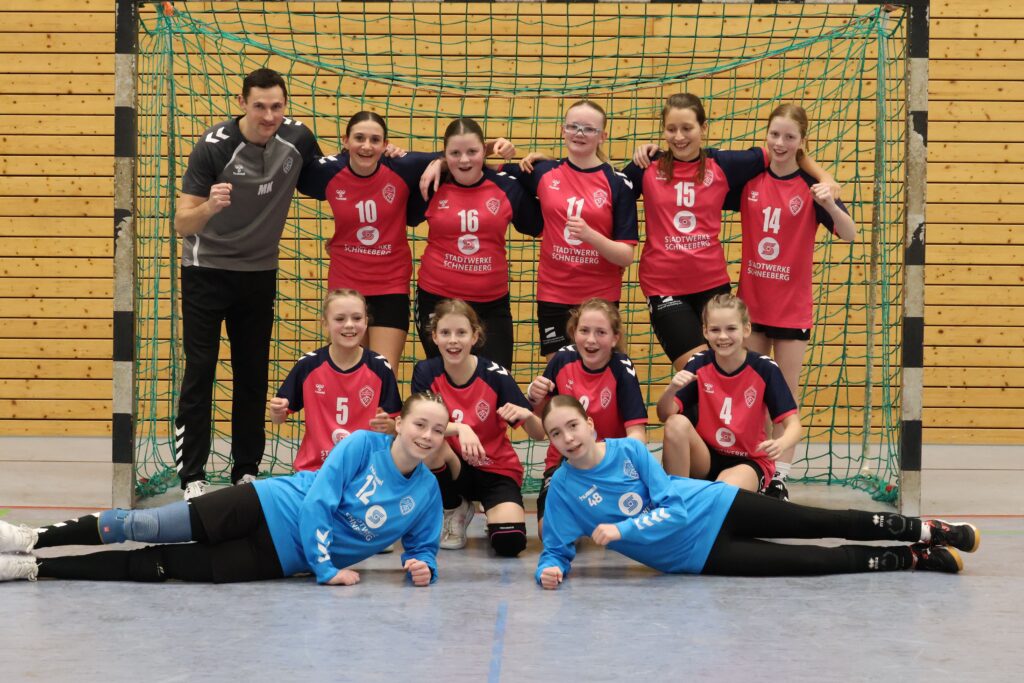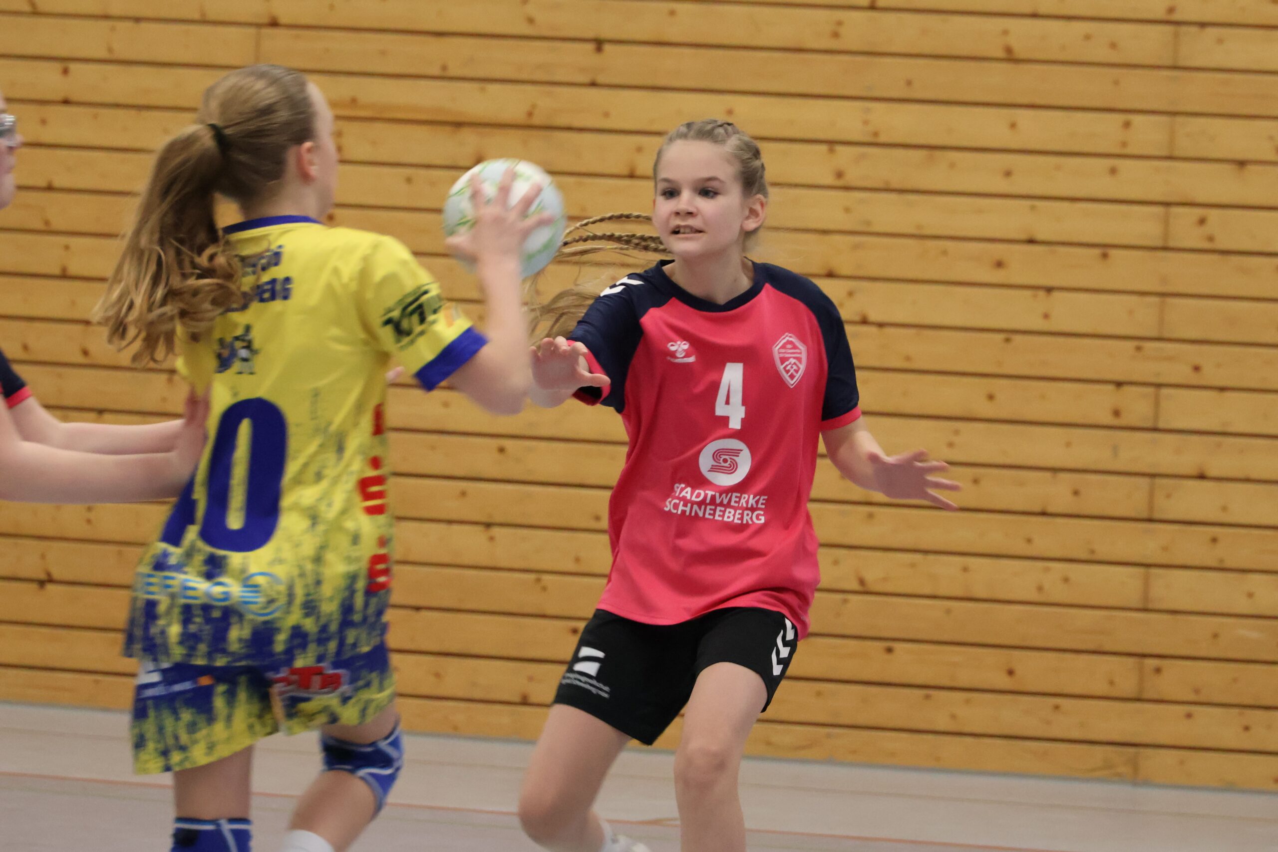 Die Partie begann unter besonderen Vorzeichen: Sowohl beide Trainer als auch einige Spielerinnen waren krankheitsbedingt angeschlagen bzw. ausgefallen. Kurzfristig übernahm unser E-Jugend-Trainer Martin die Verantwortung an der Seitenlinie und stellte die Mannschaft sehr gut auf diese ungewohnte Situation ein. Die Bedeutung des Spiels war von Beginn an spürbar, doch gerade diese Ausgangslage schien die Mannschaft zunächst eher zu hemmen als zu beflügeln. Die erste Halbzeit verlief insgesamt sehr schleppend. Die Mannschaft fand nur schwer ins Spiel und wirkte in der Anfangsphase ungeordnet und nicht konsequent genug. In der Defensive fehlte zunächst der nötige Zugriff, wodurch einfache Gegentore zugelassen wurden. Der HSV Marienberg nutzte diese Unsicherheiten konsequent aus und kam früh zu leichten Torerfolgen. Trotz des holprigen Starts gelang es unseren Mädels im weiteren Verlauf, sich etwas zu stabilisieren. Vor allem im Angriff wurde mehr Verantwortung übernommen, sodass es gelang, die Führung zu übernehmen. Ein entscheidender Faktor in dieser Phase war die starke Leistung im Tor. Mit mehreren gelungenen Paraden, darunter auch bei freien Würfen, gab unsere Charlize der Mannschaft früh Sicherheit und verhinderte, dass Marienberg besser ins Spiel kam. Auch ein Siebenmeter der Gastgeber konnte nicht genutzt werden. Bis zur Pause wurde der Vorsprung konsequent ausgebaut, sodass es mit einer verdienten 9:5-Führung in die Kabine ging.