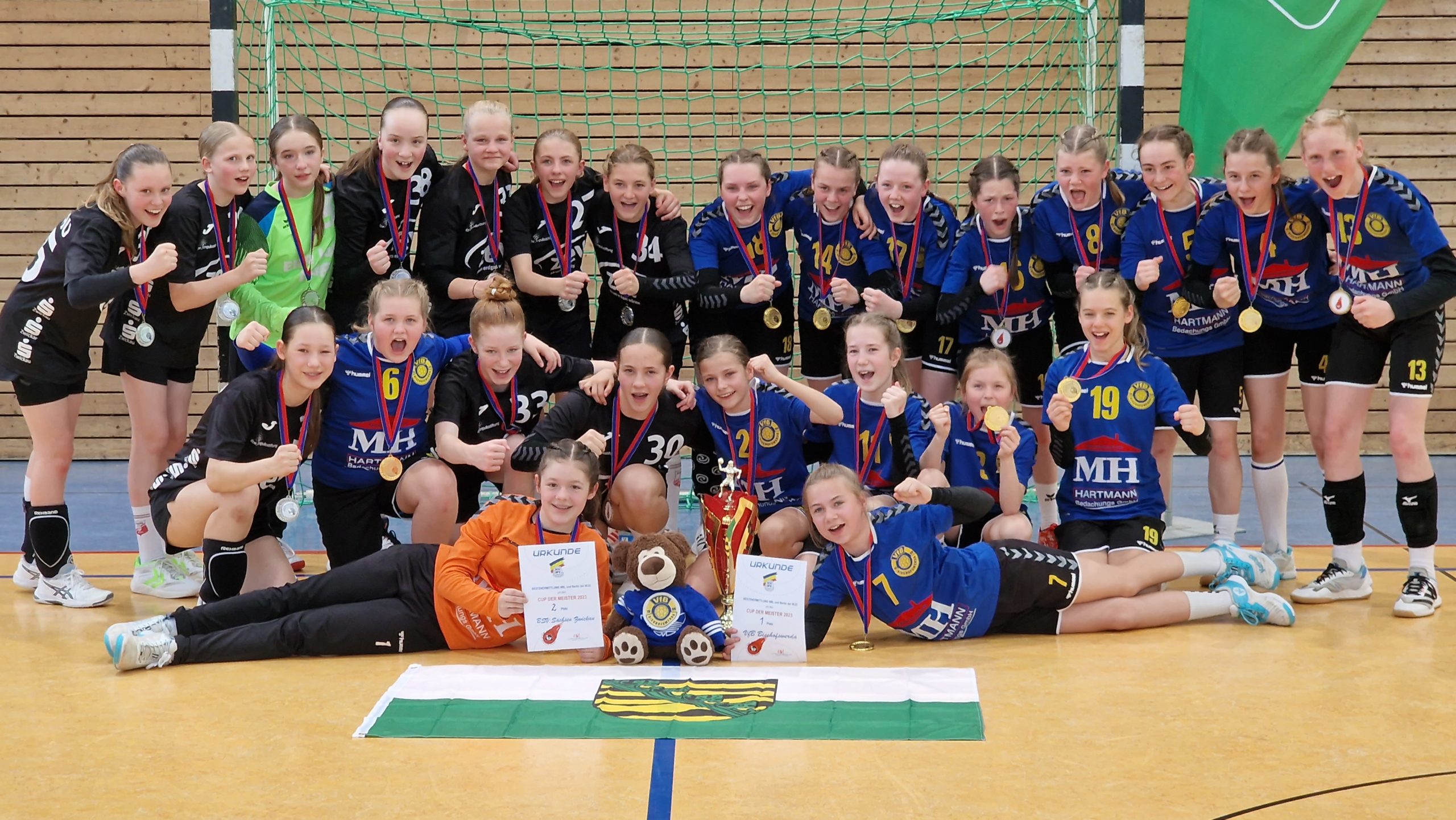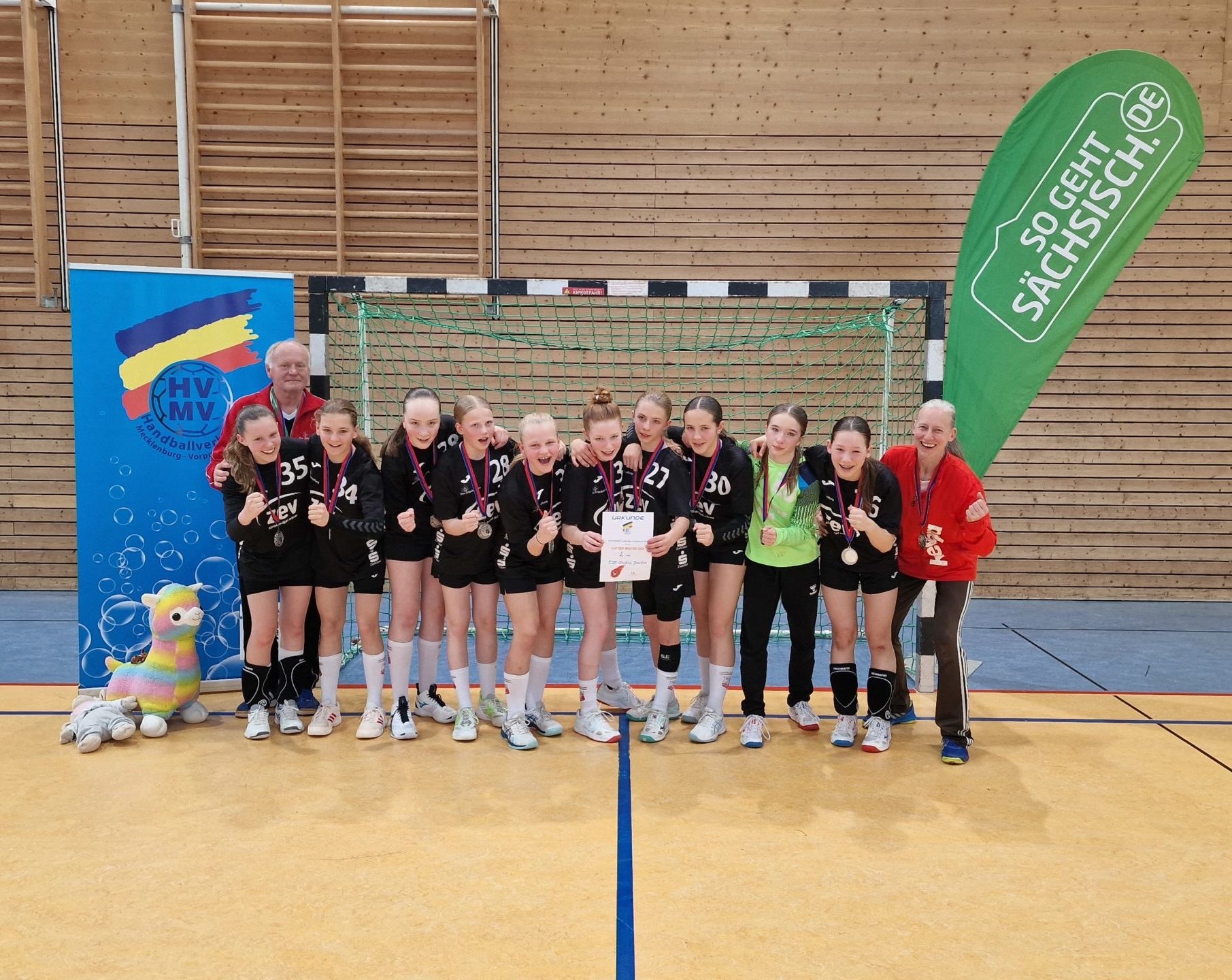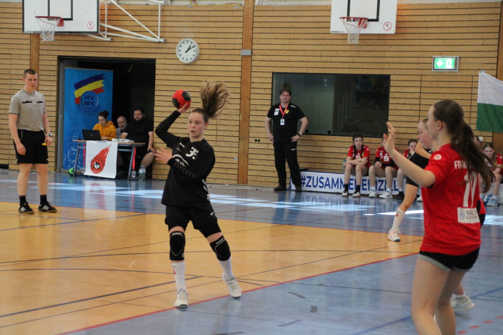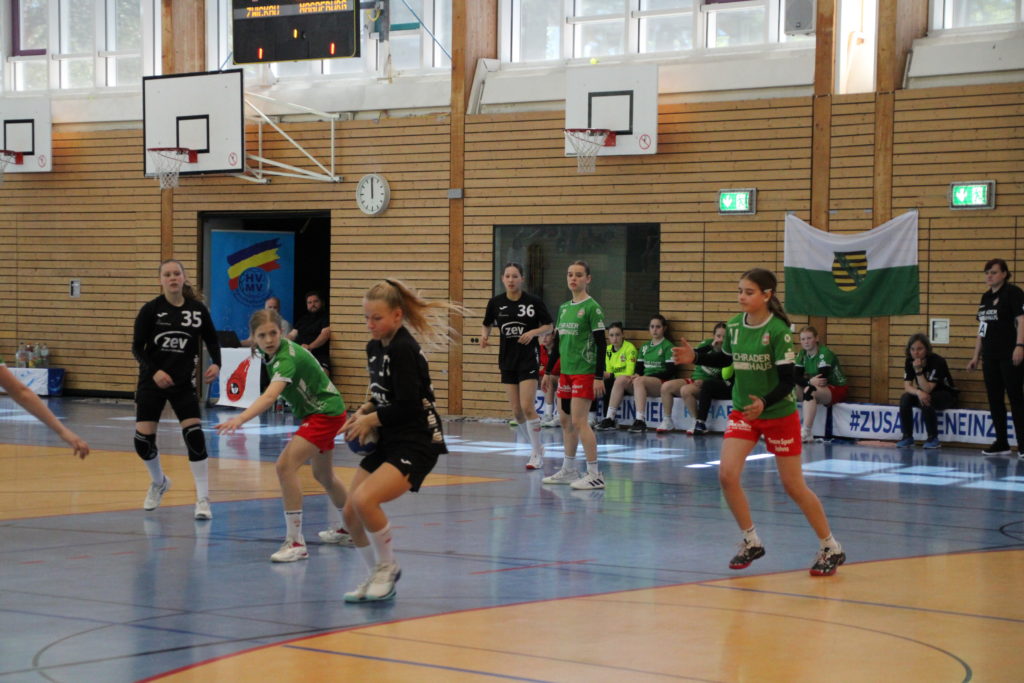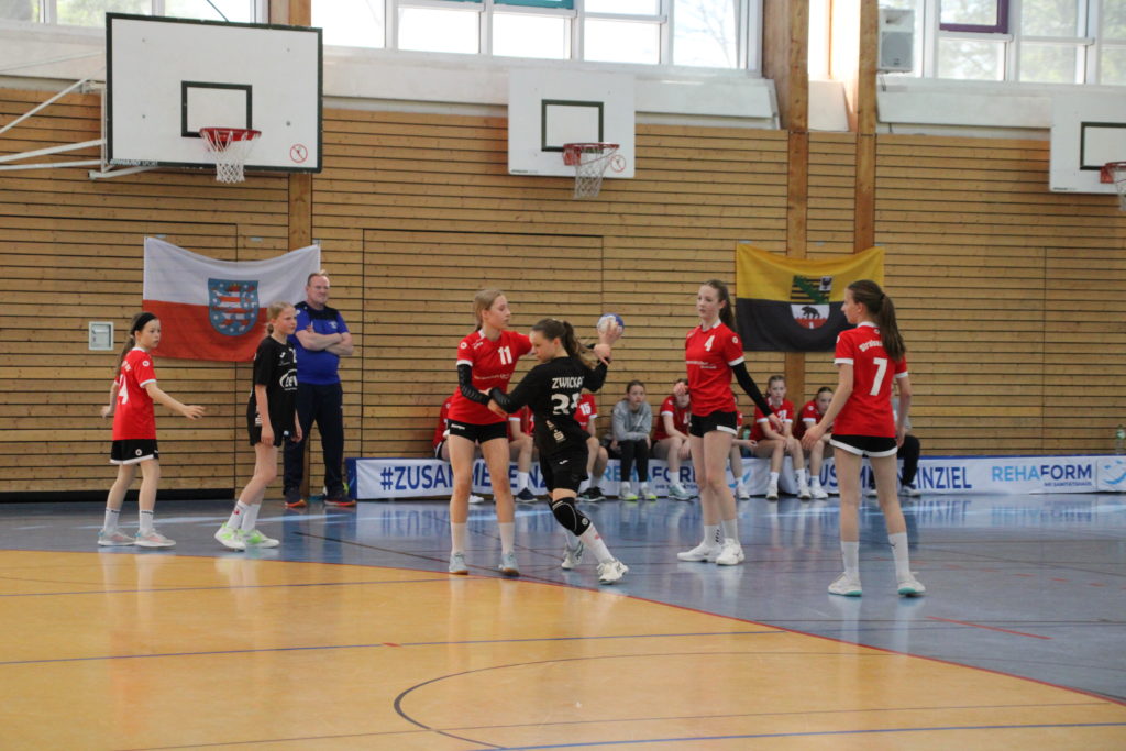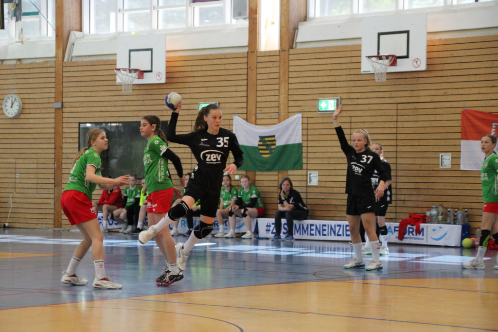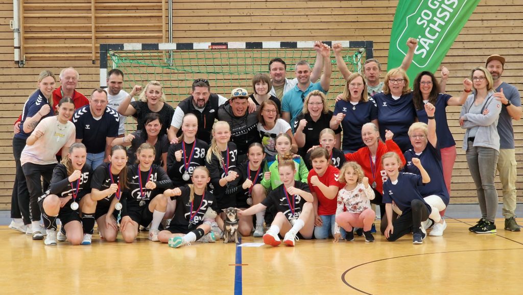 Am Wochenende fand in Stralsund die ostdeutsche Bestenermittlung der weiblichen D-Jugend statt. Mit dabei unsere Naimi mit ihrem Team vom BSV Sa. Zwickau. Alle Landesmeister und Vizemeister sind für den „Cup der Meister“ qualifiziert. Somit reiste Zwickau als Vize-Sachsenmeister gemeinsam mit dem Sachsenmeister VfB Bischofswerda vom 12.-14.05. nach Stralsund. Als Ziel setzte man sich am Samstag den Einzug in die Finalrunde zu erreichen. Völlig überraschend schafften die Zwickauer Mädels dies sogar ohne Niederlage als Platz 1 ihrer Gruppe. In der anderen Gruppe überzeugte Bischofswerda ebenfalls und schloss diese souverän als Platz 1 ab. Somit stand bereits fest, dass die beiden Teams aus Sachsen das letzte Spiel am Sonntag bestreiten werden. Zuvor mussten sich beide noch gegen Platz 2 und 3 der jeweils anderen Gruppe durchsetzen. Die mitgereisten Eltern und Fans kamen aus dem staunen nicht mehr heraus, denn beide Teams erspielten sich einen Sieg nach dem anderen. Das letzte Spiel stellte somit das große Finale dar und das zwischen den bis hier hin ungeschlagenen Teams aus Sachsen. Die Stimmung in der Halle war gigantisch. Die Mädels schraubten ihre Konzentration nochmal nach oben und zeigten auch im letzten Spiel wie geil Handball aussehen kann und das bereits mit ihren 12 Jahren! Leider verlieren die Zwickauer Mädels wie auch im Ligabetrieb knapp und holen sich am Ende die Silbermedaille. Chapeau an die Mädels beider Teams und Glückwunsch nach Bischofswerda zum Ostdeutschen Meistertitel. Das war Sachsenpower 💪🏻 Ein großes Lob noch an den Stralsunder HV und den Handballverband Mecklenburg-Vorpommern für die super Organisation dieses tollen Events!