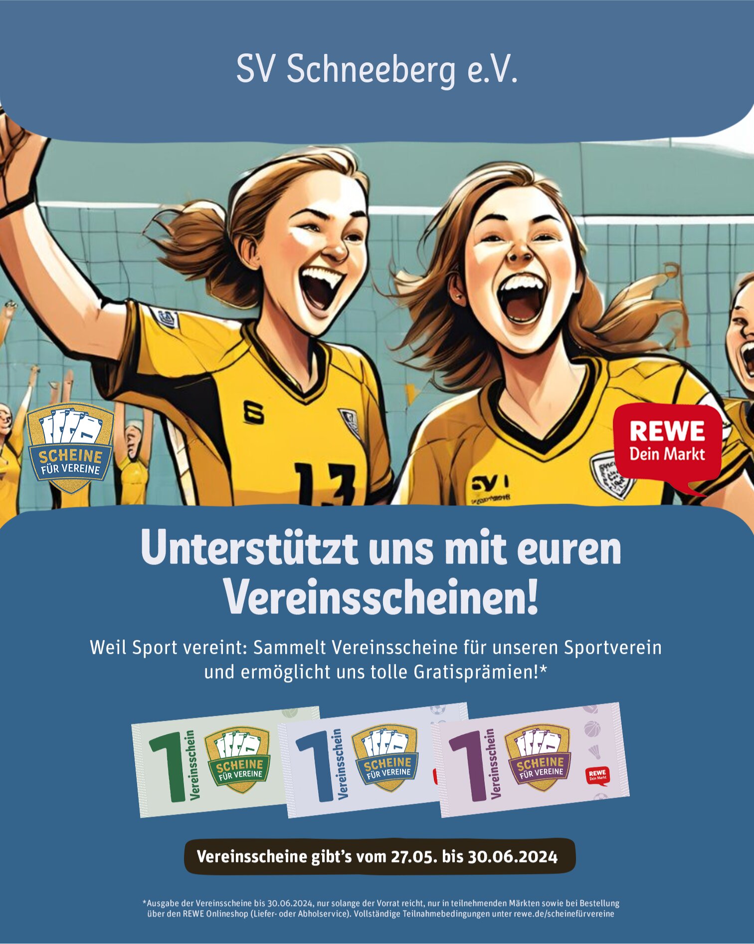 So funktioniert es: Im Zeitraum vom 27.05. bis 30.06.2024 erhältst du beim Einkauf in allen teilnehmenden REWE und nahkauf Märkten (Schneeberg) sowie bei einer Bestellung über den REWE Onlineshop (Abholservice) pro 15 € Einkaufswert 1 Vereinsschein gratis – jedoch nur, solange der Vorrat reicht. Beim REWE Lieferservice werden aus logistischen Gründen jeder Bestellung, unabhängig von der Höhe der Bestellung, 6 Vereinsscheine beigelegt.